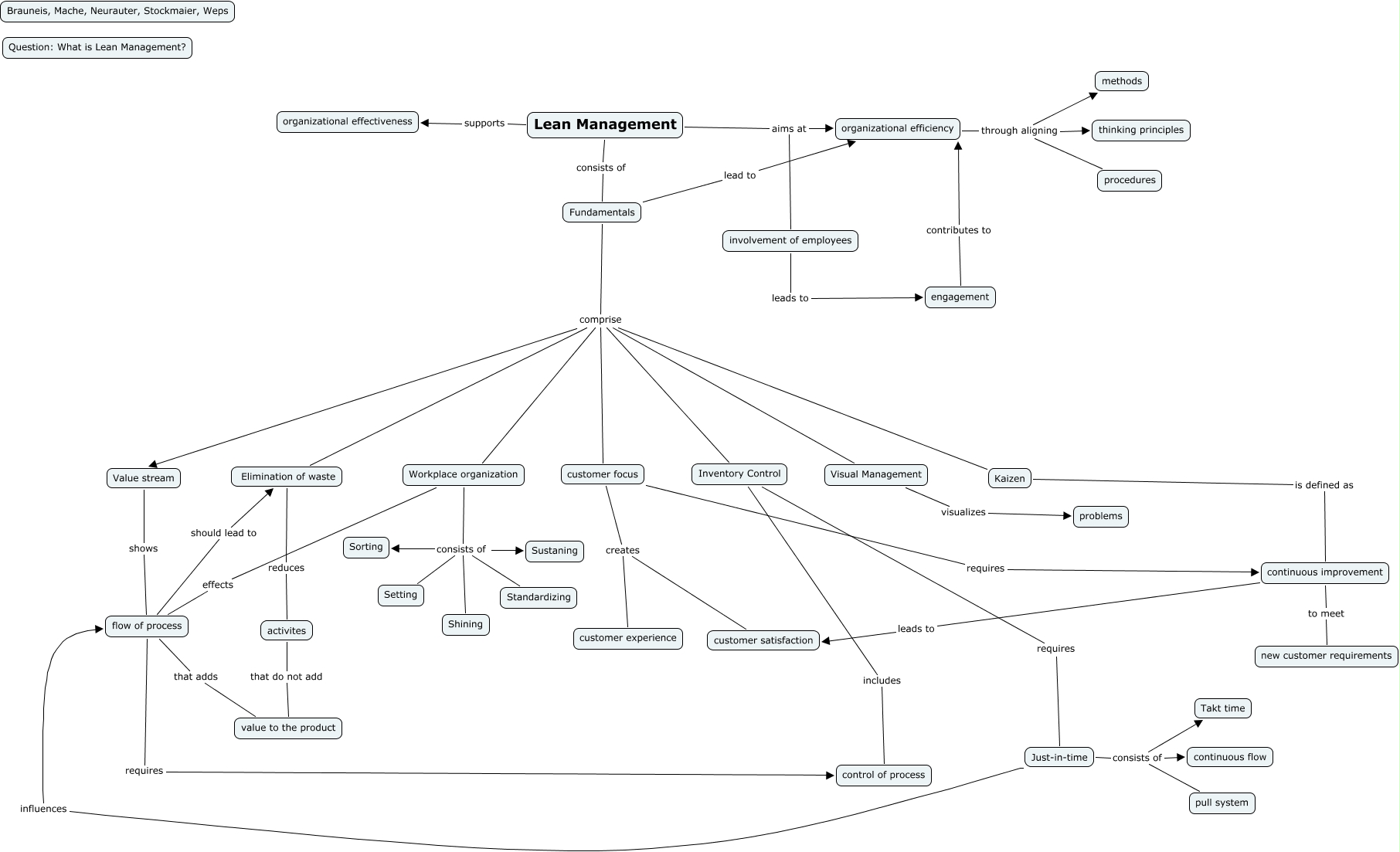 Dieses mit IHMC CmapTools erstellte CMap hat Informationen bezüglich: Lean Management, continuous improvement to meet new customer requirements, customer focus creates customer experience, flow of process requires control of process, organizational efficiency through aligning procedures, activites that do not add value to the product, continuous improvement leads to customer satisfaction, Workplace organization consists of Setting, Fundamentals comprise Elimination of waste, Inventory Control requires Just-in-time, Workplace organization consists of Shining, flow of process that adds value to the product, Fundamentals comprise Inventory Control, flow of process should lead to Elimination of waste, engagement contributes to organizational efficiency, customer focus creates customer satisfaction, Lean Management consists of Fundamentals, Lean Management aims at organizational efficiency, Elimination of waste reduces activites, Fundamentals comprise Kaizen, Workplace organization consists of Sorting
