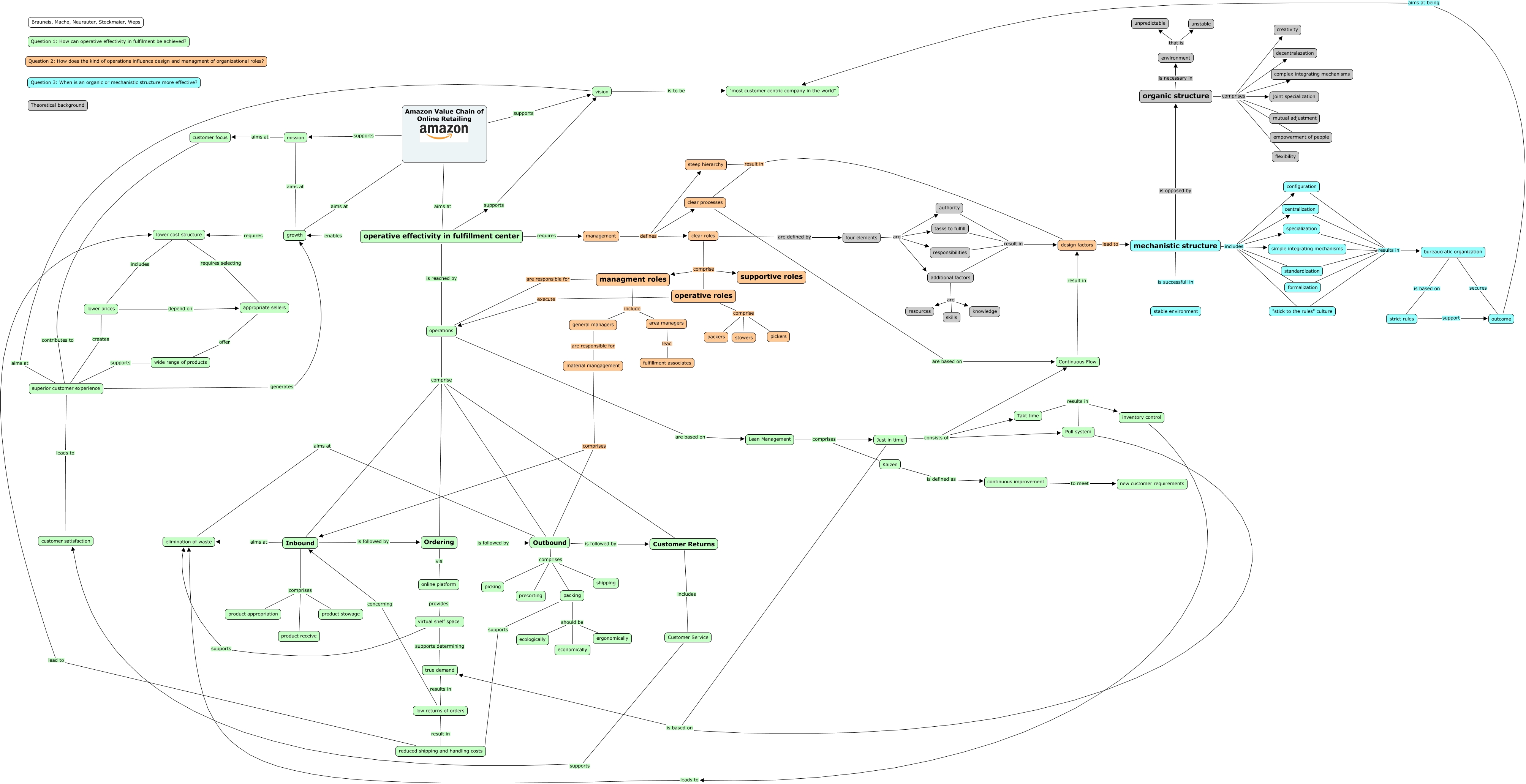 Dieses mit IHMC CmapTools erstellte CMap hat Informationen bezüglich: Amazon_Final-map, additional factors are skills, clear roles are defined by four elements, Ordering is followed by Outbound, Outbound aims at elimination of waste, Just in time consists of Takt time, operative effectivity in fulfillment center supports vision, mechanistic structure includes "stick to the rules" culture, inventory control leads to elimination of waste, specialization results in bureaucratic organization, growth requires lower cost structure, bureaucratic organization secures outcome, clear roles comprise supportive roles, Customer Returns includes Customer Service, four elements are tasks to fulfill, general managers are responsible for material mangagement, packing should be ecologically, Just in time consists of Continuous Flow, mechanistic structure includes simple integrating mechanisms, Continuous Flow result in design factors, packing should be ergonomically