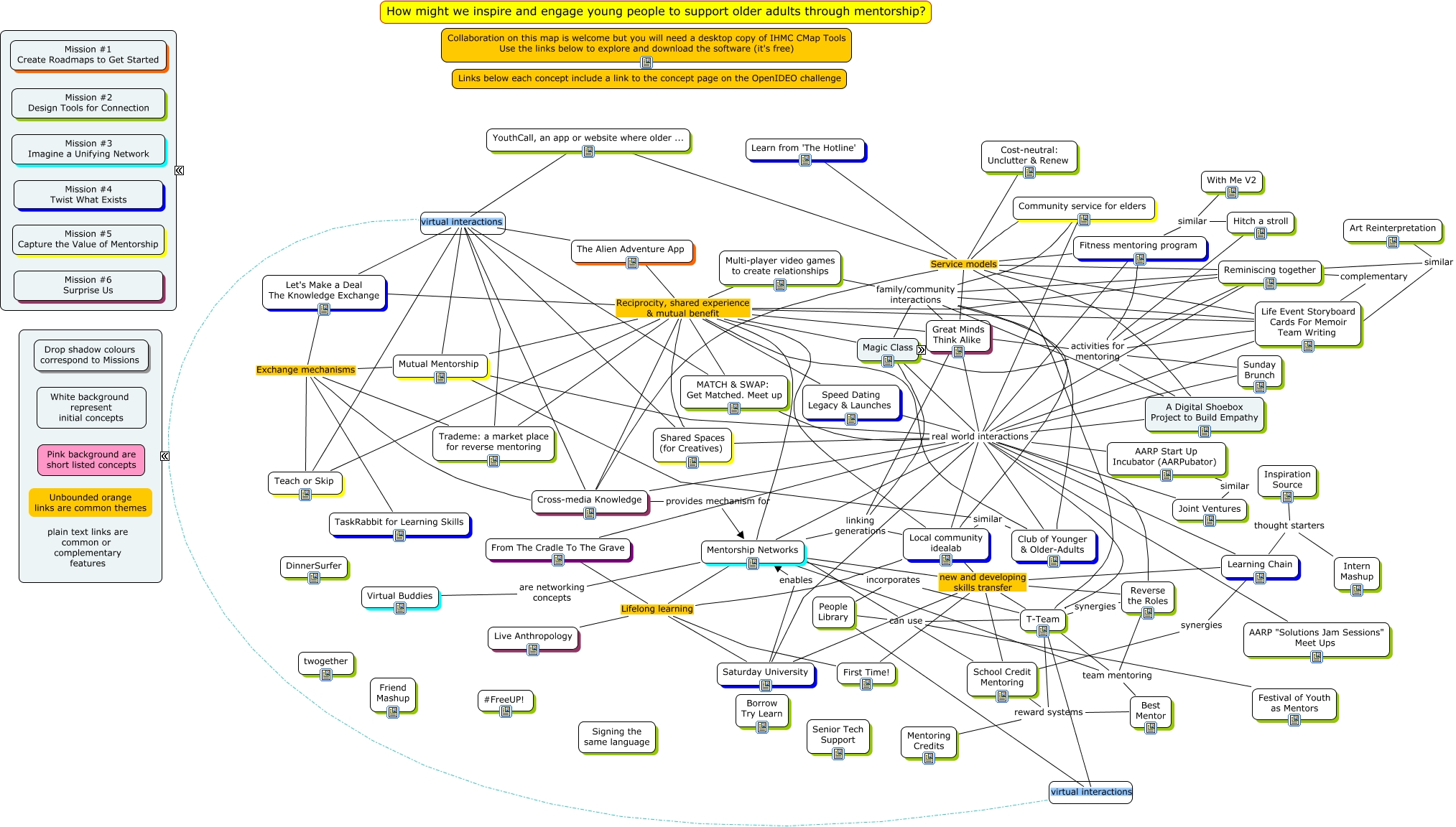 This Concept Map, created with IHMC CmapTools, has information related to: Youth Mentor Support for Seniors, Let's Make a Deal The Knowledge Exchange Reciprocity, shared experience & mutual benefit Reminiscing together, Multi-player video games to create relationships family/community interactions Local community idealab, Virtual Buddies are networking concepts Mentorship Networks, Magic Class activities for mentoring Great Minds Think Alike, Art Reinterpretation similar Reminiscing together, Teach or Skip Exchange mechanisms Let's Make a Deal The Knowledge Exchange, From The Cradle To The Grave Lifelong learning Live Anthropology, School Credit Mentoring can use Festival of Youth as Mentors, A Digital Shoebox Project to Build Empathy Service models YouthCall, an app or website where older ..., A Digital Shoebox Project to Build Empathy Service models Fitness mentoring program, A Digital Shoebox Project to Build Empathy Service models Great Minds Think Alike, Club of Younger & Older-Adults similar Mutual Mentorship, Reminiscing together complementary Life Event Storyboard Cards For Memoir Team Writing, T-Team team mentoring Best Mentor, AARP Start Up Incubator (AARPubator) real world interactions Learning Chain, Mentorship Networks new and developing skills transfer School Credit Mentoring, Let's Make a Deal The Knowledge Exchange virtual interactions Trademe: a market place for reverse mentoring, Let's Make a Deal The Knowledge Exchange virtual interactions The Alien Adventure App, People Library incorporates Mentorship Networks, Teach or Skip Exchange mechanisms Cross-media Knowledge