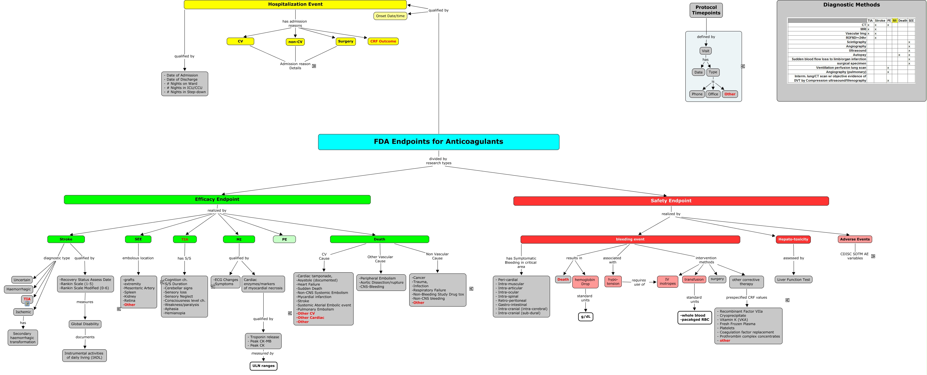 This Concept Map, created with IHMC CmapTools, has information related to: 1. Anticoagulant (All Combined - Mike), Death CV Cause -Cardiac tamponade, -Asystole (documented) -Heart Failure -Sudden Death -Non-CNS Systemic Embolism -Mycardial infarction -Stroke -Systemic Aterial Embolic event -Pulmonary Embolism -Other CV -Other Cardiac -Other, transfusion standard units -whole blood -pacakged RBC, Surgery prespecified CRF - Valve - CABG - PTCA - Cartoid endarterectomy - Peripheral Angioplasty - Limb amputation - Other, Safety Endpoint realized by Hepato-toxicity, Hepato-toxicity assessed by Liver Function Test, Visit has Type, MI qualified by Cardiac enzymes/markers of myocardial necrosis, Cardiac enzymes/markers of myocardial necrosis qualified by - Troponin release - Peak CK-MB - Peak CK, MI qualified by -ECG Changes -Symptoms, SEE embolous location -grafts -extremity -Mesenteric Artery -Spleen -Kidney -Retina -Other, Hospitalization Event has admission reasons CV, CV prespecified CRF - Angina (new) - A-Fib/Flutter - Cardiac Arrest (non-fatal), - Arrhythmia (Supraventricular) - Arrhythmia (ventricular), bleeding event has Symptomatic Bleeding in critical area - Peri-cardial - Intra-muscular - Intra-articular - Intra-ocular - Intra-spinal - Retro-peritoneal - Gastro-intestinal - Intra-cranial (intra-cerebral) - Intra-cranial (sub-dural), non-CV prespecified CRF - Cancer - Injury - Fracture - Psychiatric - Hematologic - Genito-urinary - Gastrointestinal - Diabetic Complication - Other, Efficacy Endpoint realized by MI, Stroke diagnostic type Uncertain, Death Other Vascular Cause -Peripheral Embolism -Aortic Dissection/rupture -CNS-Bleeding, FDA Endpoints for Anticoagulants qualified by Onset Date/time, -Recovery Status Assess Date -Rankin Scale (1-5) -Rankin Scale Modified (0-6) measures Global Disability, Stroke qualified by -Recovery Status Assess Date -Rankin Scale (1-5) -Rankin Scale Modified (0-6)