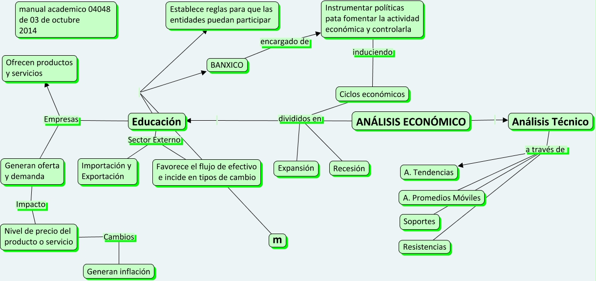 Este Cmap, tiene información relacionada con: Análisis Económico, Educación Sector Externo Importación y Exportación, Nivel de precio del producto o servicio Cambios Generan inflación, Análisis Técnico a través de Soportes, ANÁLISIS ECONÓMICO Educación, Educación Sector Externo Favorece el flujo de efectivo e incide en tipos de cambio, BANXICO encargado de Instrumentar políticas pata fomentar la actividad económica y controlarla, Ciclos económicos divididos en Expansión, Generan oferta y demanda Impacto Nivel de precio del producto o servicio, Educación Establece reglas para que las entidades puedan participar, Educación Empresas Generan oferta y demanda, Análisis Técnico a través de Resistencias, Educación m, Educación BANXICO, Ciclos económicos divididos en Recesión, Análisis Técnico a través de A. Tendencias, Instrumentar políticas pata fomentar la actividad económica y controlarla induciendo Ciclos económicos, ANÁLISIS ECONÓMICO Análisis Técnico, Educación Empresas Ofrecen productos y servicios, Análisis Técnico a través de A. Promedios Móviles