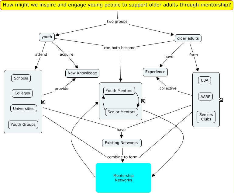 This Concept Map, created with IHMC CmapTools, has information related to: Mentorship Networks the Genesis of the Concept, Mentors Mentorship Networks, Organisations combine to form Mentorship Networks, Institutions provide New Knowledge, older adults form Organisations, youth acquire New Knowledge, Existing Networks combine to form Mentorship Networks, youth can both become Mentors, youth attend Institutions, How might we inspire and engage young people to support older adults through mentorship? two groups older adults, Senior Mentors Youth Mentors, older adults can both become Mentors, Institutions have Existing Networks, How might we inspire and engage young people to support older adults through mentorship? two groups youth, Mentorship Networks Mentors, Youth Mentors Senior Mentors, older adults have Experience, Institutions combine to form Mentorship Networks, Organisations collective Experience, Organisations have Existing Networks