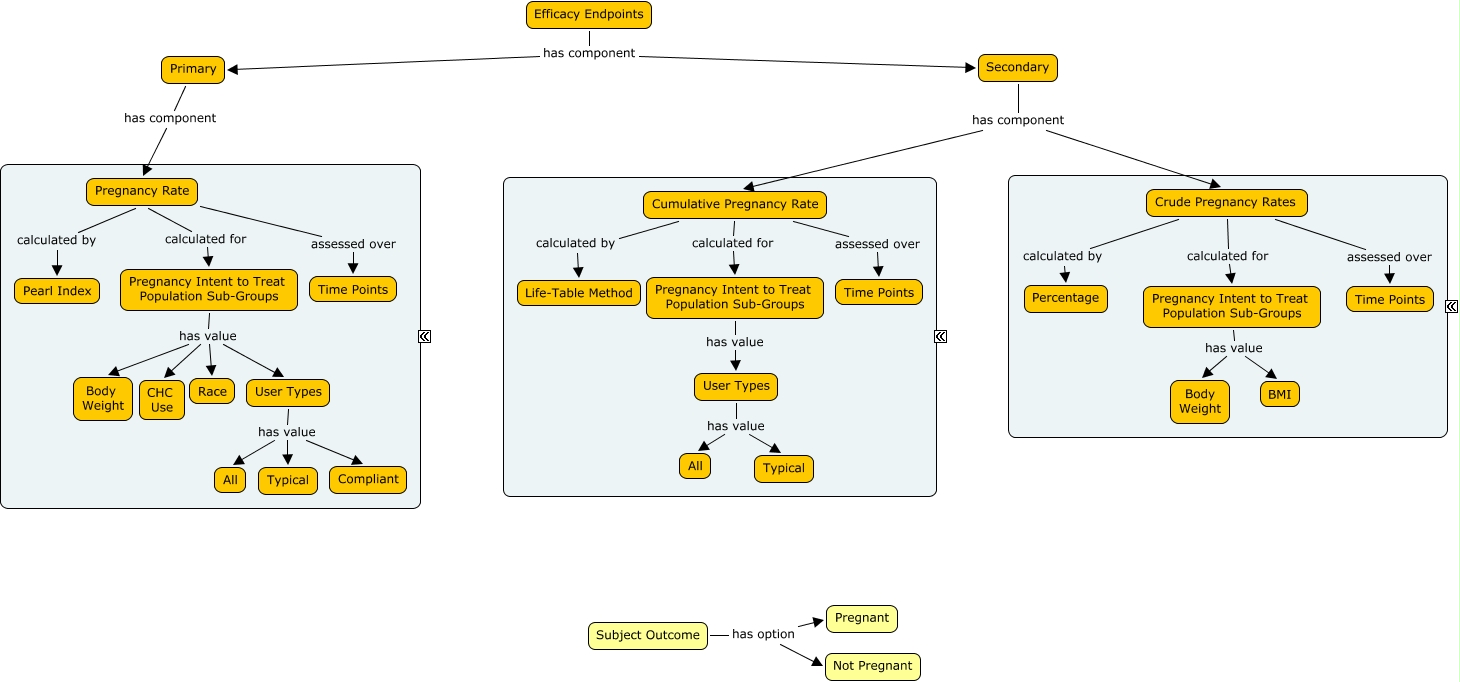 This Concept Map, created with IHMC CmapTools, has information related to: Contraceptives Efficacy Framework - v1, Pregnancy Intent to Treat Population Sub-Groups has value User Types, User Types has value All, Pregnancy Intent to Treat Population Sub-Groups has value BMI, Pregnancy Rate calculated for Pregnancy Intent to Treat Population Sub-Groups, Pregnancy Intent to Treat Population Sub-Groups has value Body Weight, Pregnancy Intent to Treat Population Sub-Groups has value User Types, Pregnancy Intent to Treat Population Sub-Groups has value Race, Crude Pregnancy Rates assessed over Time Points, Subject Outcome has option Pregnant, Subject Outcome has option Not Pregnant, User Types has value All, Pregnancy Intent to Treat Population Sub-Groups has value Body Weight, Pregnancy Rate assessed over Time Points, Efficacy Endpoints has component Primary, Pregnancy Rate calculated by Pearl Index, Secondary has component Cumulative Pregnancy Rate, User Types has value Typical, Efficacy Endpoints has component Secondary, Pregnancy Intent to Treat Population Sub-Groups has value CHC Use, Crude Pregnancy Rates calculated by Percentage