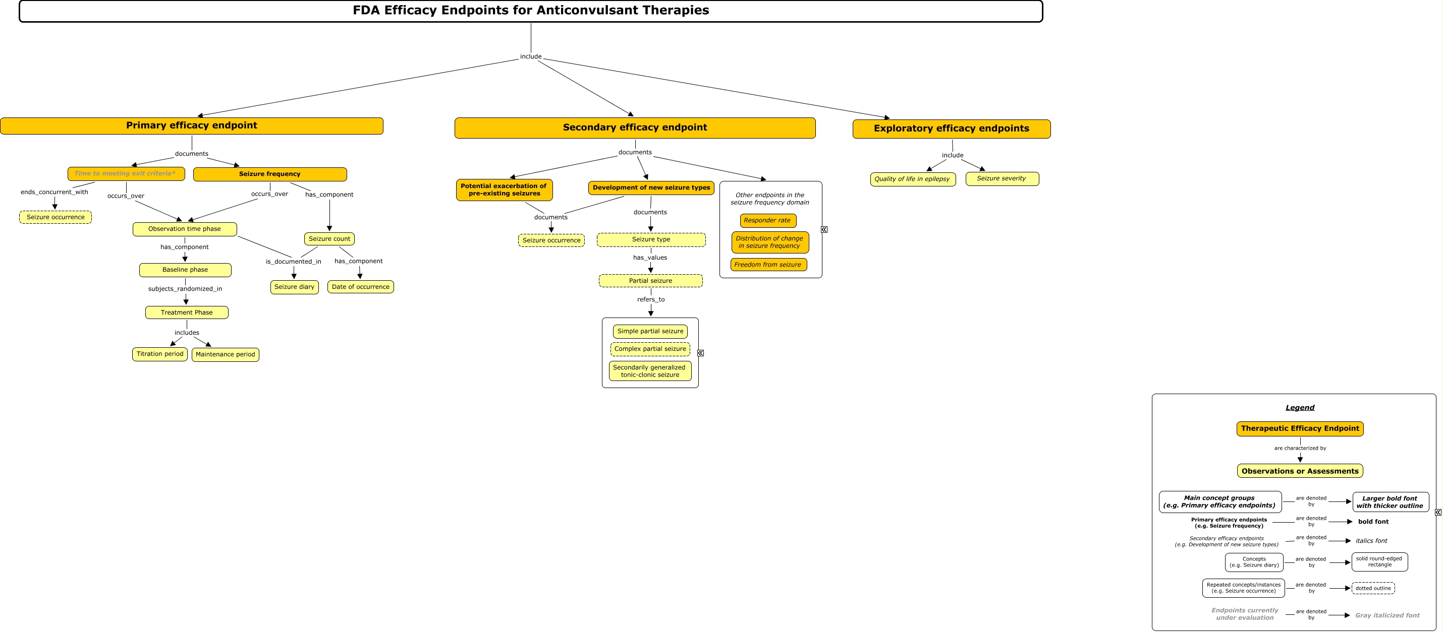 This Concept Map, created with IHMC CmapTools, has information related to: Anticonvulsant-CMAP-v8_final.cmap, Potential exacerbation of pre-existing seizures documents Seizure occurrence, Seizure type has_values Partial seizure, Treatment Phase includes Titration period, Repeated concepts/instances (e.g. Seizure occurrence) are denoted by dotted outline, FDA Efficacy Endpoints for Anticonvulsant Therapies include Secondary efficacy endpoint, Observation time phase is_documented_in Seizure diary, Primary efficacy endpoints (e.g. Seizure frequency) are denoted by bold font, Therapeutic Efficacy Endpoint are characterized by Observations or Assessments, Observation time phase has_component Baseline phase, Primary efficacy endpoint documents Time to meeting exit criteria*, Primary efficacy endpoint documents Seizure frequency, Partial seizure refers_to Partial seizure subtype, FDA Efficacy Endpoints for Anticonvulsant Therapies include Primary efficacy endpoint, Seizure count is_documented_in Seizure diary, Time to meeting exit criteria* occurs_over Observation time phase, Concepts (e.g. Seizure diary) are denoted by solid round-edged rectangle, Development of new seizure types documents Seizure occurrence, Seizure frequency occurs_over Observation time phase, Secondary efficacy endpoint documents Other endpoints in seizure frequency domain, Seizure frequency has_component Seizure count