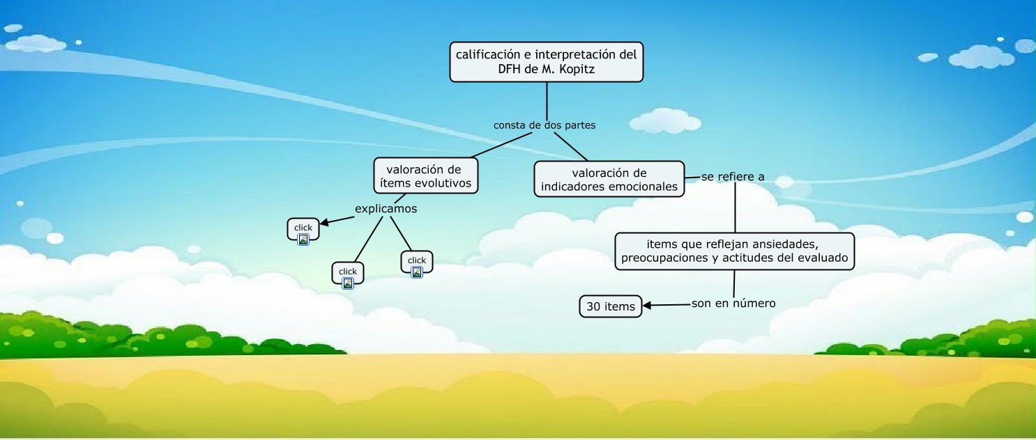 Este Cmap, tiene información relacionada con: DFH-KOPITZ, calificación e interpretación del DFH de M. Kopitz consta de dos partes valoración de indicadores emocionales, valoración de ítems evolutivos explicamos click, valoración de ítems evolutivos explicamos click, items que reflejan ansiedades, preocupaciones y actitudes del evaluado son en número 30 items, calificación e interpretación del DFH de M. Kopitz consta de dos partes valoración de ítems evolutivos, valoración de ítems evolutivos explicamos click, valoración de indicadores emocionales se refiere a items que reflejan ansiedades, preocupaciones y actitudes del evaluado