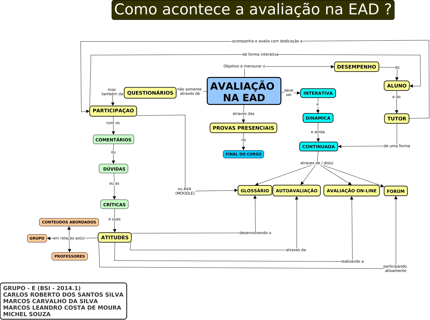 Esse mapa conceitual, produzido no IHMC CmapTools, tem a informação relacionada a: 1 SEM - 4a semana - atividade - mapa conceitual da avaliacao na EAD, ATITUDES em relação ao(s) GRUPO, ATITUDES em relação ao(s) CONTEUDOS ABORDADOS, PARTICIPAÇAO de forma interativa ALUNO, CONTINUADA atraves de / do(s) FORÚM, TUTOR de uma forma CONTINUADA, ATITUDES realizando a AVALIAÇÃO ON-LINE, PARTICIPAÇAO com os COMENTÁRIOS, ALUNO e do TUTOR, ATITUDES atraves da AUTOAVALIAÇÃO, AVALIAÇÃO NA EAD atraves das PROVAS PRESENCIAIS, COMENTÁRIOS ou DÚVIDAS, CONTINUADA atraves de / do(s) GLOSSÁRIO, PROVAS PRESENCIAIS no FINAL DO CURSO, DESEMPENHO do ALUNO, AVALIAÇÃO NA EAD deve ser INTERATIVA, CONTINUADA atraves de / do(s) AVALIAÇÃO ON-LINE, ATITUDES desenvolvendo o GLOSSÁRIO, INTERATIVA e DINAMICA, AVALIAÇÃO NA EAD Objetivo e mensurar o DESEMPENHO, AVALIAÇÃO NA EAD não somente através de QUESTIONÁRIOS