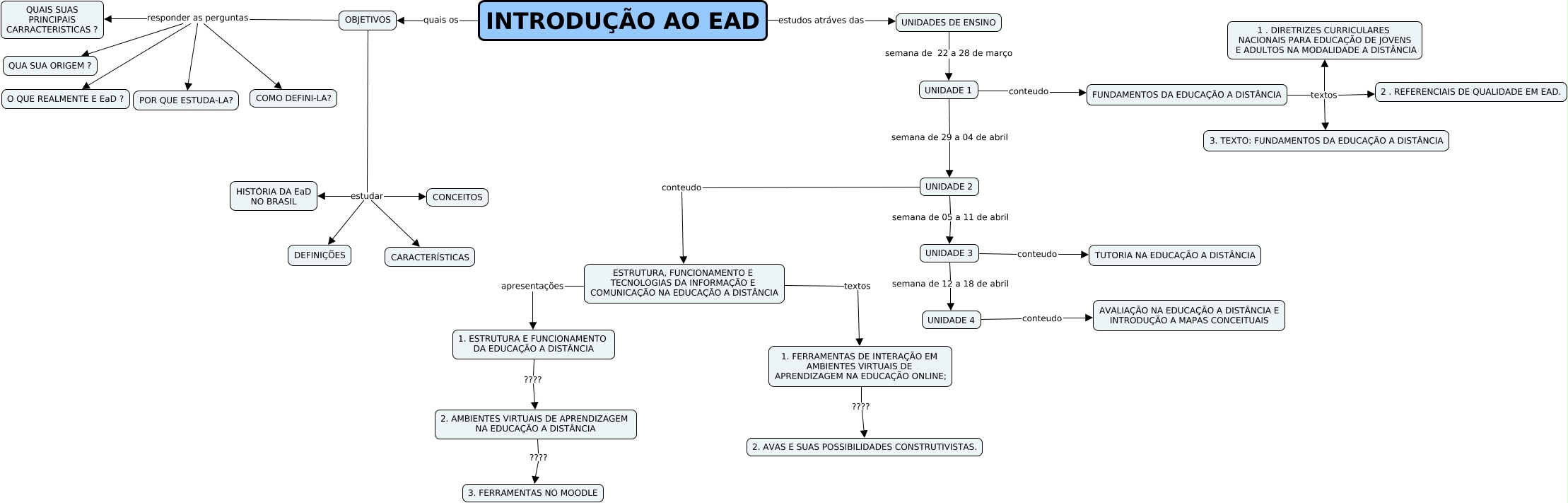 Esse mapa conceitual, produzido no IHMC CmapTools, tem a informação relacionada a: 00 - int ead - resumo das semanas, ESTRUTURA, FUNCIONAMENTO E TECNOLOGIAS DA INFORMAÇÃO E COMUNICAÇÃO NA EDUCAÇÃO A DISTÂNCIA apresentações 1. ESTRUTURA E FUNCIONAMENTO DA EDUCAÇÃO A DISTÂNCIA, OBJETIVOS responder as perguntas POR QUE ESTUDA-LA?, INTRODUÇÃO AO EAD estudos atráves das UNIDADES DE ENSINO, OBJETIVOS estudar DEFINIÇÕES, OBJETIVOS responder as perguntas O QUE REALMENTE E EaD ?, OBJETIVOS responder as perguntas COMO DEFINI-LA?, FUNDAMENTOS DA EDUCAÇÃO A DISTÂNCIA textos 3. TEXTO: FUNDAMENTOS DA EDUCAÇÃO A DISTÂNCIA, INTRODUÇÃO AO EAD quais os OBJETIVOS, UNIDADE 1 semana de 29 a 04 de abril UNIDADE 2, 2. AMBIENTES VIRTUAIS DE APRENDIZAGEM NA EDUCAÇÃO A DISTÂNCIA ???? 3. FERRAMENTAS NO MOODLE, UNIDADE 2 conteudo ESTRUTURA, FUNCIONAMENTO E TECNOLOGIAS DA INFORMAÇÃO E COMUNICAÇÃO NA EDUCAÇÃO A DISTÂNCIA, UNIDADE 2 semana de 05 a 11 de abril UNIDADE 3, OBJETIVOS responder as perguntas QUA SUA ORIGEM ?, UNIDADES DE ENSINO semana de 22 a 28 de março UNIDADE 1, OBJETIVOS estudar CARACTERÍSTICAS, FUNDAMENTOS DA EDUCAÇÃO A DISTÂNCIA textos 2 . REFERENCIAIS DE QUALIDADE EM EAD., OBJETIVOS estudar HISTÓRIA DA EaD NO BRASIL, 1. ESTRUTURA E FUNCIONAMENTO DA EDUCAÇÃO A DISTÂNCIA ???? 2. AMBIENTES VIRTUAIS DE APRENDIZAGEM NA EDUCAÇÃO A DISTÂNCIA, FUNDAMENTOS DA EDUCAÇÃO A DISTÂNCIA textos 1 . DIRETRIZES CURRICULARES NACIONAIS PARA EDUCAÇÃO DE JOVENS E ADULTOS NA MODALIDADE A DISTÂNCIA, 1. FERRAMENTAS DE INTERAÇÃO EM AMBIENTES VIRTUAIS DE APRENDIZAGEM NA EDUCAÇÃO ONLINE; ???? 2. AVAS E SUAS POSSIBILIDADES CONSTRUTIVISTAS.