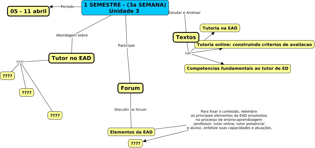 Esse mapa conceitual, produzido no IHMC CmapTools, tem a informação relacionada a: 1 SEM - 3a semana, 1 SEMESTRE - (3a SEMANA) Unidade 3 Período 05 - 11 abril, 1 SEMESTRE - (3a SEMANA) Unidade 3 Estudar e Analisar Textos, Textos Ler Competencias fundamentais ao tutor de ED, Tutor no EAD ???? ????, Tutor no EAD ???? ????, Textos Ler Tutoria na EAD, 1 SEMESTRE - (3a SEMANA) Unidade 3 Participar Forum, Textos Ler Tutoria online: construindo criterios de avaliacao, 1 SEMESTRE - (3a SEMANA) Unidade 3 Abordagem sobre Tutor no EAD, Tutor no EAD ???? ????, Forum Discultir no forum Elementos da EAD, Elementos da EAD Para fixar o conteúdo, relembre os principais elementos da EAD envolvidos no processo de ensino-aprendizagem (professor, tutor online, tutor presencial e aluno), enfatize suas capacidades e atuações. ????
