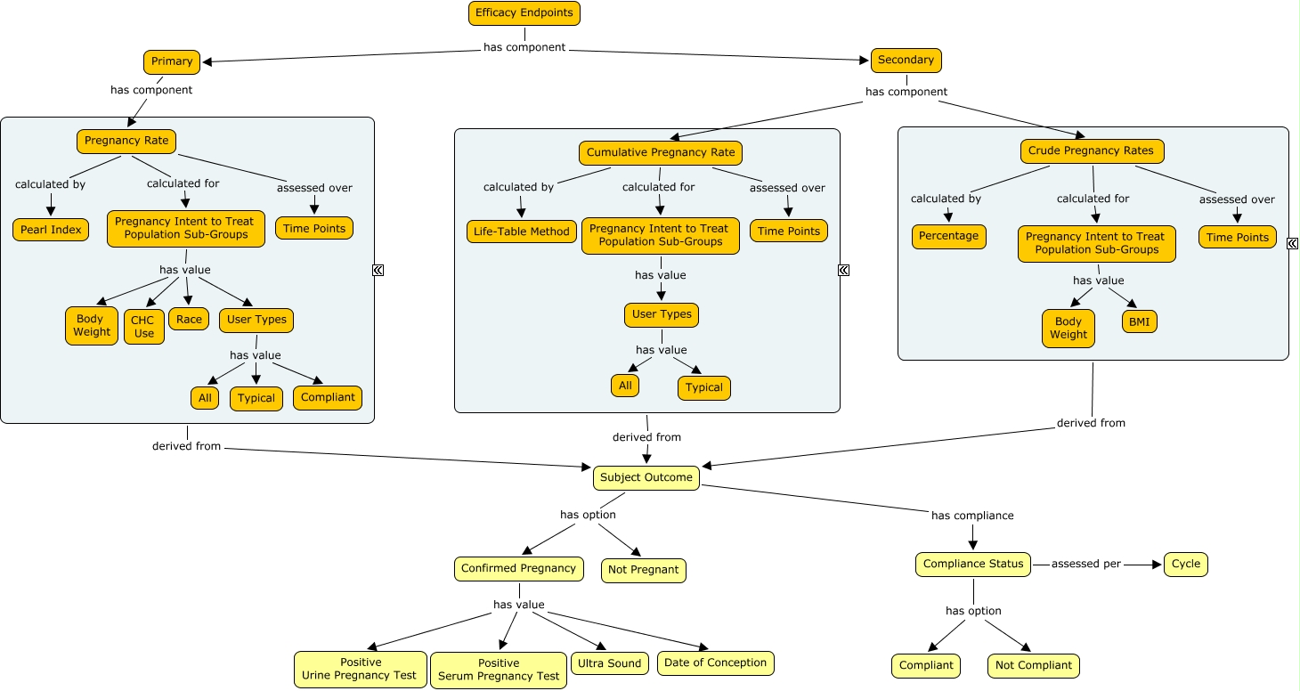 This Concept Map, created with IHMC CmapTools, has information related to: Contraceptives Efficacy Framework - v1-1, User Types has value All, Compliance Status assessed per Cycle, User Types has value Typical, Cumulative Pregnancy Rate calculated for Pregnancy Intent to Treat Population Sub-Groups, ???? derived from Subject Outcome, Subject Outcome has option Confirmed Pregnancy, User Types has value All, User Types has value Typical, Confirmed Pregnancy has value Positive Serum Pregnancy Test, Efficacy Endpoints has component Primary, Subject Outcome has option Not Pregnant, ???? derived from Subject Outcome, ???? derived from Subject Outcome, Pregnancy Rate calculated for Pregnancy Intent to Treat Population Sub-Groups, Pregnancy Intent to Treat Population Sub-Groups has value Body Weight, Crude Pregnancy Rates calculated for Pregnancy Intent to Treat Population Sub-Groups, Crude Pregnancy Rates calculated by Percentage, Pregnancy Intent to Treat Population Sub-Groups has value Body Weight, Subject Outcome has compliance Compliance Status, Cumulative Pregnancy Rate calculated by Life-Table Method