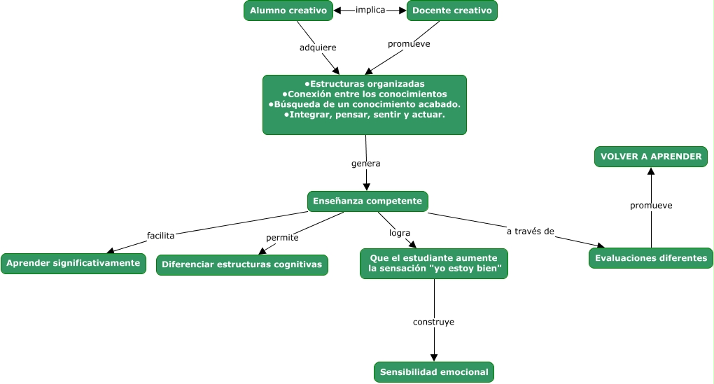Este Cmap, tiene información relacionada con: ACTIVIDAD 1 UNIDAD 4, Enseñanza competente logra Que el estudiante aumente la sensación "yo estoy bien", Evaluaciones diferentes promueve VOLVER A APRENDER, Docente creativo promueve • Estructuras organizadas • Conexión entre los conocimientos • Búsqueda de un conocimiento acabado. • Integrar, pensar, sentir y actuar., • Estructuras organizadas • Conexión entre los conocimientos • Búsqueda de un conocimiento acabado. • Integrar, pensar, sentir y actuar. genera Enseñanza competente, Enseñanza competente a través de Evaluaciones diferentes, Que el estudiante aumente la sensación "yo estoy bien" construye Sensibilidad emocional, Alumno creativo adquiere • Estructuras organizadas • Conexión entre los conocimientos • Búsqueda de un conocimiento acabado. • Integrar, pensar, sentir y actuar., Enseñanza competente facilita Aprender significativamente, Enseñanza competente permite Diferenciar estructuras cognitivas