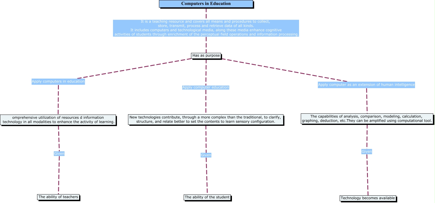 Este Cmap, tiene información relacionada con: Proyecto Educativo Institucional, omprehensive utilization of resources d information technology in all modalities to enhance the activity of learning. Given The ability of teachers, The capabilities of analysis, comparison, modeling, calculation, graphing, deduction, etc.They can be amplified using computational tool. Given Technology becomes available, Has as purpose Apply computers in education omprehensive utilization of resources d information technology in all modalities to enhance the activity of learning., New technologies contribute, through a more complex than the traditional, to clarify, structure, and relate better to set the contents to learn sensory configuration. Given The ability of the student, Has as purpose Apply computer as an extension of human intelligence The capabilities of analysis, comparison, modeling, calculation, graphing, deduction, etc.They can be amplified using computational tool., Computers in Education It is a teaching resource and covers all means and procedures to collect, store, transmit, process and retrieve data of all kinds. It includes computers and technological media, along these media enhance cognitive activities of students through enrichment of the perceptual field operations and information processing. Has as purpose, Has as purpose Apply computer education New technologies contribute, through a more complex than the traditional, to clarify, structure, and relate better to set the contents to learn sensory configuration.