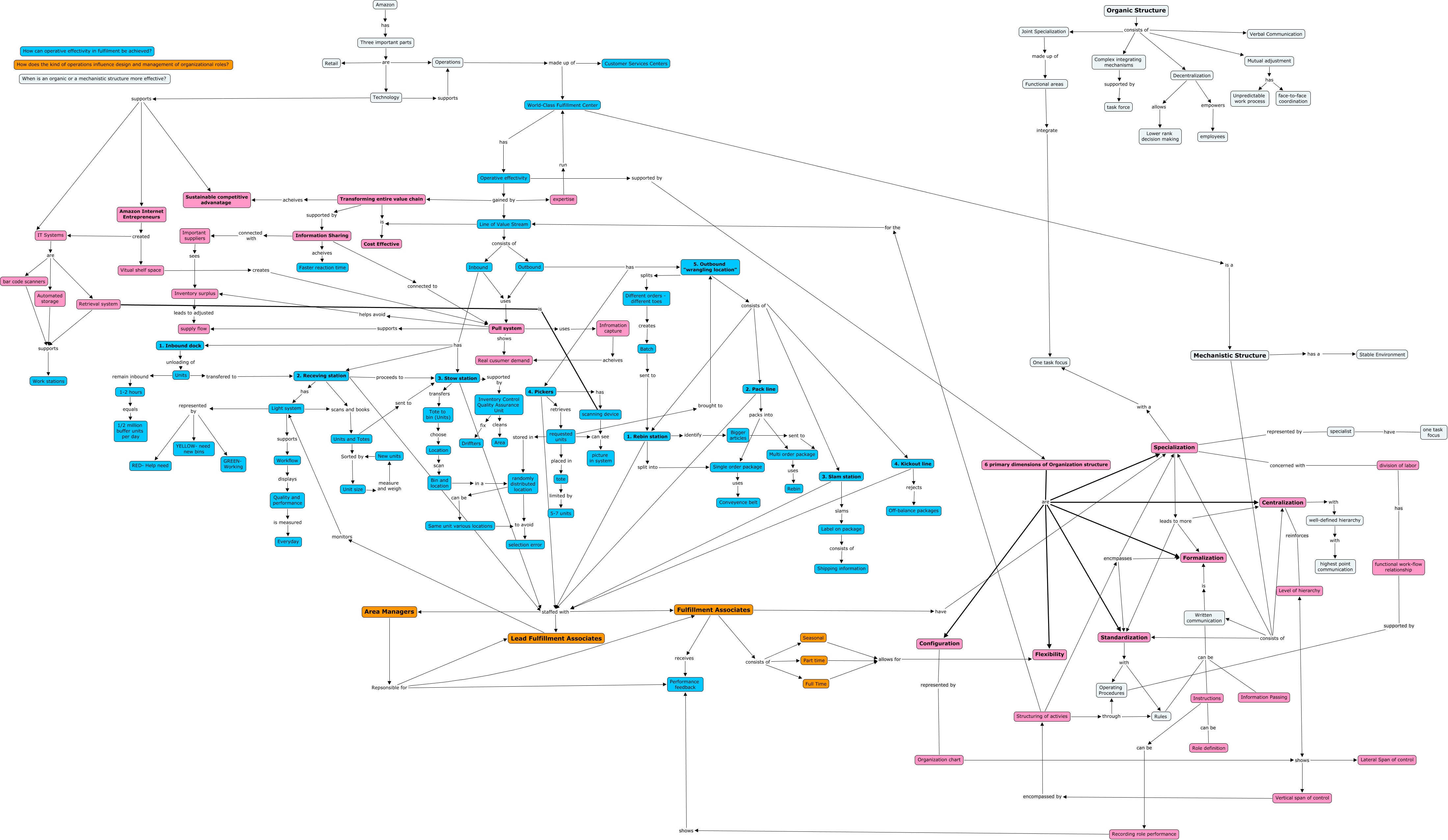 Dieses mit IHMC CmapTools erstellte CMap hat Informationen bezüglich: Second_Map_Amazon, Mechanistic Structure consists of Centralization, Structuring of activies through Operating Procedures, Light system represented by RED- Help need, 3. Slam station slams Label on package, Location scan Bin and location, expertise run World-Class Fulfillment Center, Amazon Internet Entrepreneurs created IT Systems, Three important parts are Operations, IT Systems are Retrieval system, 3. Slam station staffed with Fulfillment Associates, Operative effectivity gained by Line of Value Stream, New units Sorted by Unit size, Specialization represented by specialist, Written communication can be Rules, Mutual adjustment has Unpredictable work process, Mechanistic Structure consists of Standardization, requested units placed in tote, requested units brought to 5. Outbound "wrangling location", 1. Rebin station staffed with Lead Fulfillment Associates, Structuring of activies encmpasses Formalization