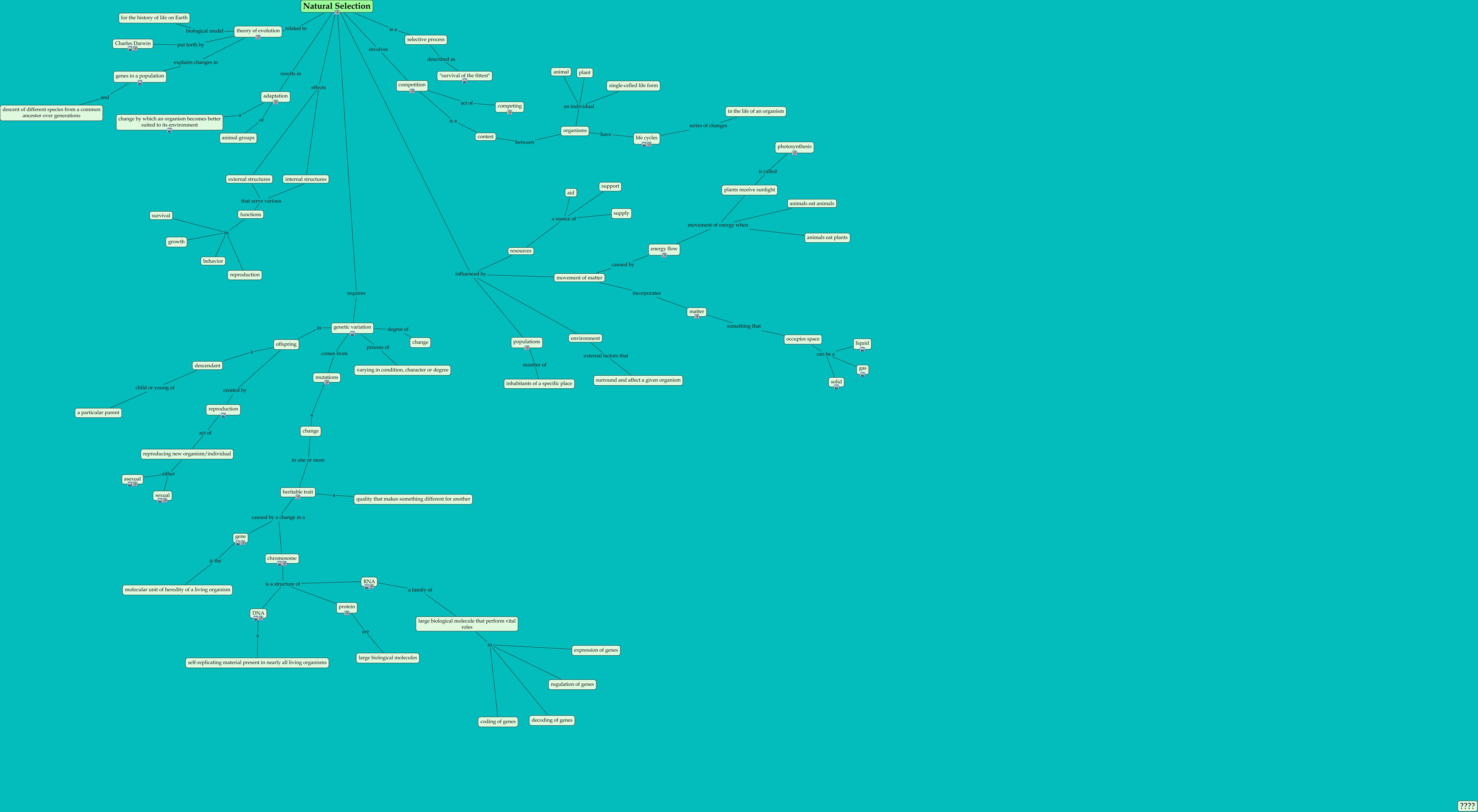 This Concept Map, created with IHMC CmapTools, has information related to: Natural Selection, offspring created by reproduction, heritable trait caused by a change in a gene, change in one or more heritable trait, large biological molecule that perform vital roles in decoding of genes, Natural Selection influenced by resources, Natural Selection effects external structures, large biological molecule that perform vital roles in coding of genes, functions that serve various external structures, energy flow movement of energy when animals eat plants, Natural Selection effects internal structures, movement of matter incorporates matter, genetic variation process of varying in condition, character or degree, reproduction act of reproducing new organism/individual, chromosome is a structure of RNA, genetic variation comes from mutations, functions in behavior, functions in survival, occupies space can be a gas, protein are large biological molecules, adaptation of animal groups