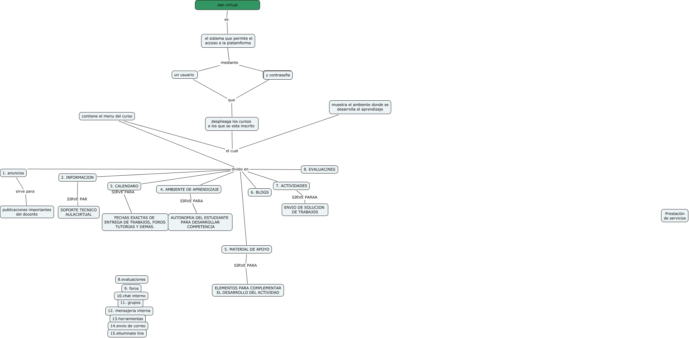 Este Cmap, tiene información relacionada con: lina marcela salazar, un usuario mediante ????, contiene el menu del curso divido en 1. anuncios, un usuario mediante y contraseña, 4. AMBIENTE DE APRENDIZAJE SIRVE PARA AUTONOMIA DEL ESTUDIANTE PARA DESARROLLAR COMPETENCIA, contiene el menu del curso divido en 2. INFORMACION, contiene el menu del curso divido en 5. MATERIAL DE APOYO, ean virtual es el sistema que permite el acceso a la platamforma, contiene el menu del curso divido en 3. CALENDARO, desplieaga los cursos a los que se esta inscrito el cual muestra el ambiente donde se desarrolla el aprendizaje, contiene el menu del curso divido en 7. ACTIVIDADES, 1. anuncios sirve para publicaciones importantes del docente, un usuario que y contraseña, desplieaga los cursos a los que se esta inscrito el cual contiene el menu del curso, un usuario que desplieaga los cursos a los que se esta inscrito, contiene el menu del curso divido en 4. AMBIENTE DE APRENDIZAJE, 2. INFORMACION SIRVE PAR SOPORTE TECNICO AULACIRTUAL, 7. ACTIVIDADES SIRVE PARAA ENVIO DE SOLUCION DE TRABAJOS, contiene el menu del curso divido en 6. BLOGS, contiene el menu del curso divido en 8. EVALUACINES, 5. MATERIAL DE APOYO SIRVE PARA ELEMENTOS PARA COMPLEMENTAR EL DESARROLLO DEL ACTIVIDAD