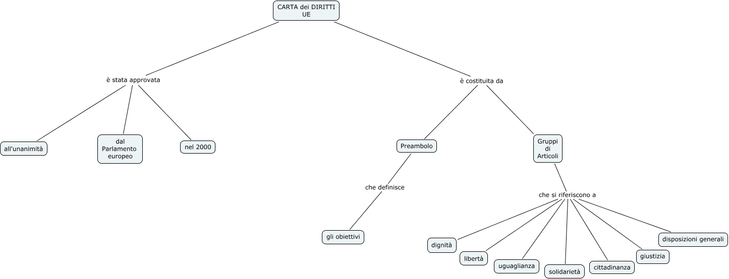 Questa Cmap, creata con IHMC CmapTools, contiene informazioni relative a: Carta Diritti UE, CARTA dei DIRITTI UE è costituita da Preambolo, Gruppi di Articoli che si riferiscono a solidarietà, Gruppi di Articoli che si riferiscono a libertà, Gruppi di Articoli che si riferiscono a uguaglianza, CARTA dei DIRITTI UE è costituita da Gruppi di Articoli, Gruppi di Articoli che si riferiscono a disposizioni generali, CARTA dei DIRITTI UE è stata approvata dal Parlamento europeo, CARTA dei DIRITTI UE è stata approvata all'unanimità, Gruppi di Articoli che si riferiscono a cittadinanza, Gruppi di Articoli che si riferiscono a giustizia, CARTA dei DIRITTI UE è stata approvata nel 2000, Preambolo che definisce gli obiettivi, Gruppi di Articoli che si riferiscono a dignità