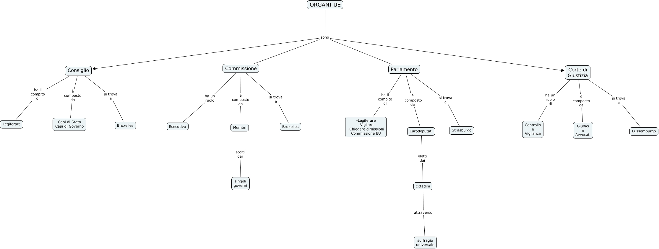 Questa Cmap, creata con IHMC CmapTools, contiene informazioni relative a: ORGANI UE_bellinazzi cristina, Consiglio ha il compito di Legiferare, Eurodeputati eletti dai cittadini, Parlamento è composto da Eurodeputati, Consiglio è composto da Capi di Stato Capi di Governo, ORGANI UE sono Parlamento, Consiglio si trova a Bruxelles, cittadini attraverso suffragio universale, Parlamento ha il compito di -Legiferare -Vigilare -Chiedere dimissioni Commissione EU, ORGANI UE sono Commissione, Corte di Giustizia si trova a Lussemburgo, ORGANI UE sono Corte di Giustizia, Parlamento si trova a Strasburgo, Corte di Giustizia è composto da Giudici e Avvocati, Commissione è composto da Membri, ORGANI UE sono Consiglio, Commissione si trova a Bruxelles, Corte di Giustizia ha un ruolo di Controllo e Vigilanza, Membri scelti dai singoli governi, Commissione ha un ruolo Esecutivo