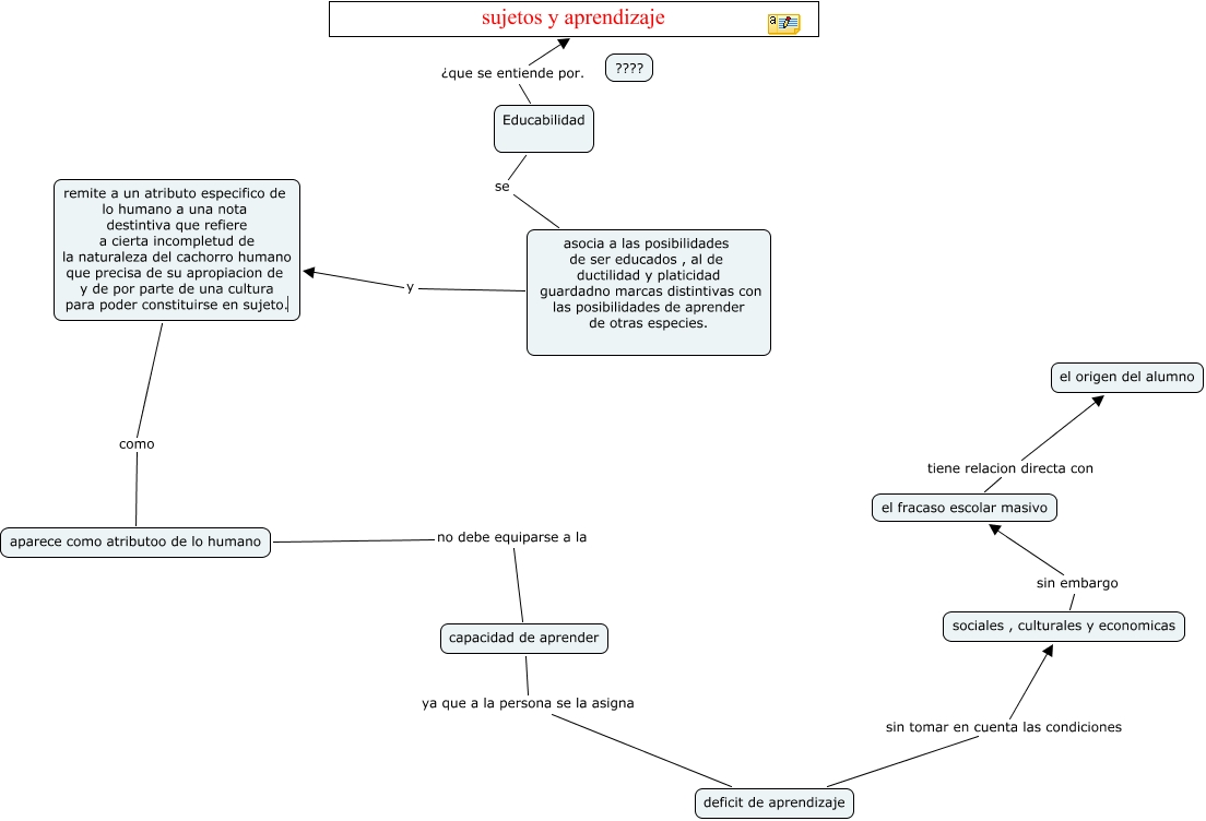 Este Cmap, tiene información relacionada con: cesar13, Educabilidad se asocia a las posibilidades de ser educados , al de ductilidad y platicidad guardadno marcas distintivas con las posibilidades de aprender de otras especies., aparece como atributoo de lo humano no debe equiparse a la capacidad de aprender, remite a un atributo especifico de lo humano a una nota destintiva que refiere a cierta incompletud de la naturaleza del cachorro humano que precisa de su apropiacion de y de por parte de una cultura para poder constituirse en sujeto. como aparece como atributoo de lo humano, el fracaso escolar masivo tiene relacion directa con el origen del alumno, asocia a las posibilidades de ser educados , al de ductilidad y platicidad guardadno marcas distintivas con las posibilidades de aprender de otras especies. y remite a un atributo especifico de lo humano a una nota destintiva que refiere a cierta incompletud de la naturaleza del cachorro humano que precisa de su apropiacion de y de por parte de una cultura para poder constituirse en sujeto., sociales , culturales y economicas sin embargo el fracaso escolar masivo, Educabilidad ¿que se entiende por. sujetos y aprendizaje, capacidad de aprender ya que a la persona se la asigna deficit de aprendizaje, deficit de aprendizaje sin tomar en cuenta las condiciones sociales , culturales y economicas