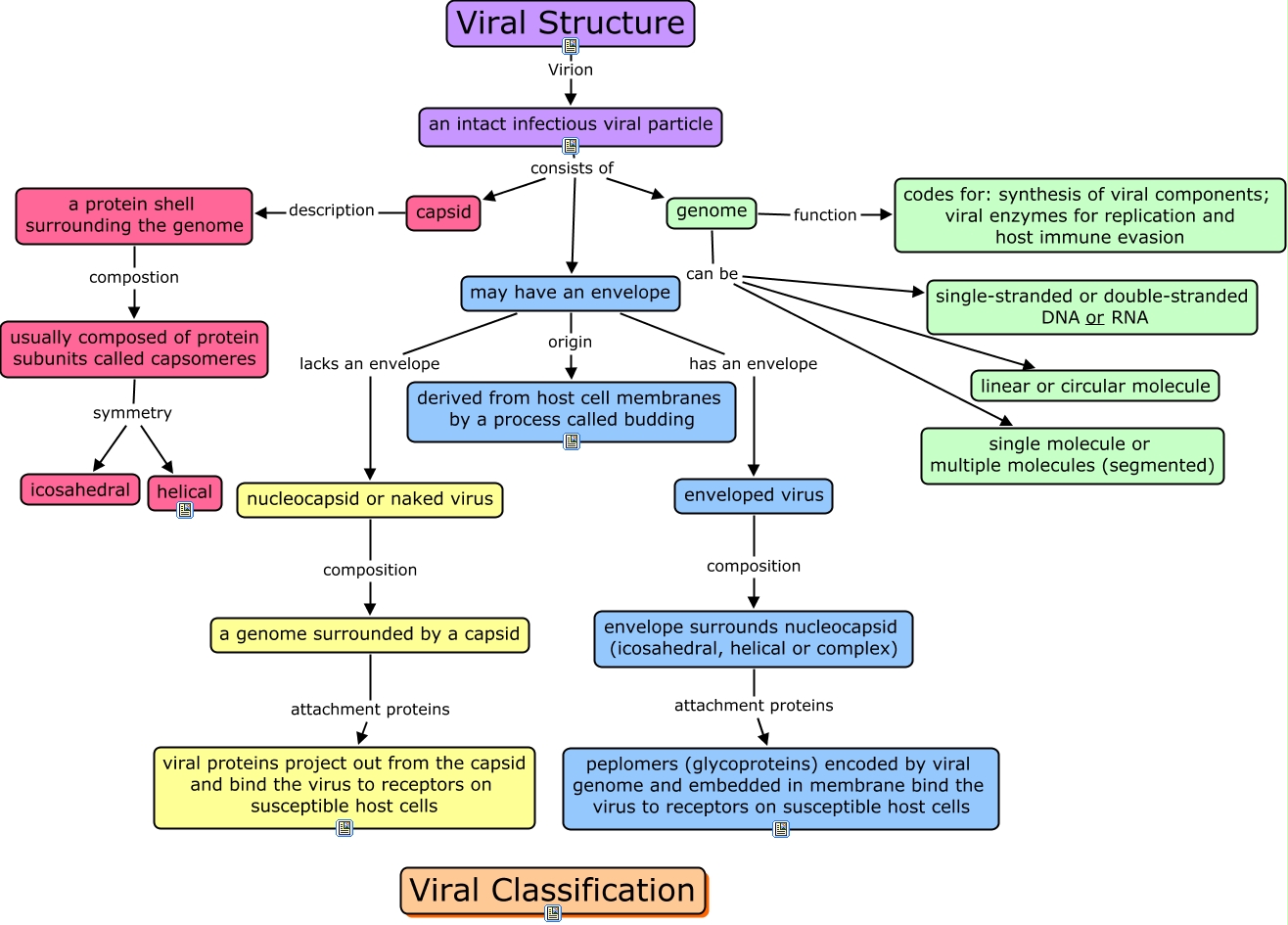 This Concept Map, created with IHMC CmapTools, has information related to: Viral Structure cmap IID 8_2014 presentation, nucleocapsid or naked virus composition a genome surrounded by a capsid, genome function codes for: synthesis of viral components; viral enzymes for replication and host immune evasion, enveloped virus composition envelope surrounds nucleocapsid (icosahedral, helical or complex), usually composed of protein subunits called capsomeres symmetry helical, a protein shell surrounding the genome compostion usually composed of protein subunits called capsomeres, Viral Structure Virion an intact infectious viral particle, may have an envelope has an envelope enveloped virus, may have an envelope origin derived from host cell membranes by a process called budding, a genome surrounded by a capsid attachment proteins viral proteins project out from the capsid and bind the virus to receptors on susceptible host cells, an intact infectious viral particle consists of capsid, may have an envelope lacks an envelope nucleocapsid or naked virus, genome can be single molecule or multiple molecules (segmented), an intact infectious viral particle consists of genome, genome can be single-stranded or double-stranded DNA or RNA, envelope surrounds nucleocapsid (icosahedral, helical or complex) attachment proteins peplomers (glycoproteins) encoded by viral genome and embedded in membrane bind the virus to receptors on susceptible host cells, capsid description a protein shell surrounding the genome, usually composed of protein subunits called capsomeres symmetry icosahedral, genome can be linear or circular molecule, an intact infectious viral particle consists of may have an envelope