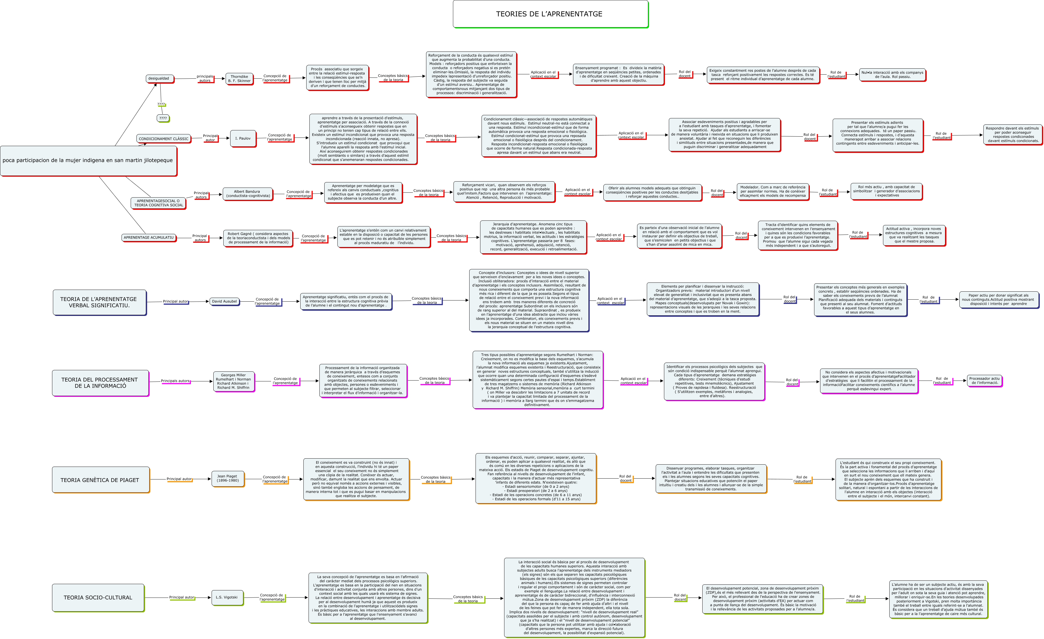 Esse mapa conceitual, produzido no IHMC CmapTools, tem a informação relacionada a: Teories aprenentatge final, Concepte d’inclusors: Conceptes o idees de nivell superior que serveixen d’enclavament per a les noves idees o conceptes. Inclusió obliteradora: procés d’interacció entre el material d’aprenentatge i els conceptes inclusors. Assimilació, resultant de nous coneixements que comporta una estructura cognitiva més rica i diferent de la que ja es posseïa.Segons el tipus de relació entre el coneixement previ i la nova informació ens trobem amb tres maneres diferents de concreció del procés: aprenentatge Subordinat on els inclusors són de rang superior al del material. Supraordinat , es produeix en l’aprenentatge d’una idea abstracte que inclou vàries idees ja incorporades. Combinatori, els coneixements previs i els nous material se situen en un mateix nivell dins la jerarquia conceptual de l’estructura cognitiva. Aplicació en el context escolar Elements per planificar i dissenyar la instrucció: Organitzadors previs: material introductori d’un nivell elevat de generalitat i inclusivitat que es presenta abans del material d’aprenentatge, que s’adeqüi a la tasca proposta. Mapes conceptuals(desenvolupats per Novak i Gowin): representacions visuals de les jerarquies i les seves relacions entre conceptes i que es troben en la ment., poca participacion de la mujer indigena en san martin jilotepeque ???? CONDICIONAMENT CLÀSSIC, Identificar els processos psicològics dels subjectes que són condició indispensable perquè l’alumnat aprengui. Cada tipus d’aprenentatge demana estratègies diferents: Creixement (tècniques d’estudi repetitives, tests mnemotècnics), Ajustament ( Proves de rapidesa i fluïdesa). Reestructuració ( S’utilitzen exemples, metàfores i analogies, entre d’altres). Rol del docent No considera els aspectes afectius i motivacionals que intervenen en el procés d’aprenentatgeFacilitador d’estratègies que li facilitin el processament de la informacióFacilitar coneixements científics a l’alumne perquè esdevingui expert., APRENENTAGESOCIAL O TEORIA COGNITIVA SOCIAL Principal autors Albert Bandura (conductista-cognitivista), Jerarquia d'aprenentatge. Anomena cinc tipus de capacitats humanes que es poden aprendre : les destreses i habilitats intel•lectuals , les habilitats motrius, la informació verbal, les actituds i les estratègies cognitives. L'aprenentatge passaria per 8 fases: motivació, aprehensió, adquisició, retenció, record, generalització, execució i retroalimentació. Aplicació en el context escolar Es parteix d'una observació inicial de l'alumne en relació amb el comportament que es vol instaurar per definir els objectius de treball, que s’esmicolen en petits objectius i que s’han d’anar assolint de mica en mica., poca participacion de la mujer indigena en san martin jilotepeque ???? desigualdad, Condicionament clàssic—associació de respostes automàtiques davant nous estímuls. Estímul neutral-no està connectat a una resposta. Estímul incondicionat-estímul que de forma automàtica provoca una resposta emocional o fisiològica. Estímul condicionat-estímul que provoca una reposada emocional o fisiològica després del condicionament. Resposta incondicionat-resposta emocional o fisiològica que ocorre de forma natural.Resposta condicionada-resposta apresa davant un estímul que abans era neutral. Aplicació en el context escolar Associar esdeveniments positius i agradables per a l'estudiant amb tasques d'aprenentatge, i fomentar la seva repetició. Ajudar als estudiants a arriscar-se de manera voluntària i reeixida en situacions que li produixen ansietat. Ajudar al fet que reconeguin les diferències i similituds entre situacions presentades,de manera que puguin discriminar i generalitzar adequadament, Tres tipus possibles d’aprenentatge segons Rumelhart i Norman: Creixement, on no es modifica la base dels esquemes, s’acumula la nova informació als esquemes ja existents.Ajustament, l’alumnat modifica esquemes existents i Reestructuració, que consisteix en generar noves estructures conceptuals, també s’utilitza la inducció que ocorre quan una determinada configuració d’esquemes s’esdevé sistemàticament segons certes pautes d’espai i temps.Establiment de tres magatzems o sistemes de memòria (Richard Atkinson y Richard M. Shiffrin) Memòria sensorial,memòria a curt termini ( on Miller va descobrir les limitacions a 7 unitats de record i va plantejar la capacitat limitada del processament de la informació ) i memòria a llarg termini que és on s’emmagatzema definitivament. Aplicació en el context escolar Identificar els processos psicològics dels subjectes que són condició indispensable perquè l’alumnat aprengui. Cada tipus d’aprenentatge demana estratègies diferents: Creixement (tècniques d’estudi repetitives, tests mnemotècnics), Ajustament ( Proves de rapidesa i fluïdesa). Reestructuració ( S’utilitzen exemples, metàfores i analogies, entre d’altres)., Tracta d’identificar quins elements de coneixement intervenen en l’ensenyament i quines són les condicions favorables per a que es produeixi l’aprenentatge. Promou que l’alumne sigui cada vegada més independent i a que s’autoreguli. Rol de l’estudiant Actitud activa , incorpora noves estructures cognitives a mesura que va realitzant les tasques que el mestre proposa., Modelador. Com a marc de referència per assimilar normes. Ha de conèixer eficaçment els models de recompensa Rol de l’estudiant Rol més actiu , amb capacitat de simbolitzar i generador d’associacions i expectatives, El desenvolupament potencial, zona de desenvolupament pròxim (ZDP),és el més rellevant des de la perspectiva de l'ensenyament. Per això, el professional de l'educació ha de crear zones de desenvolupament pròxim (activitats d'EA) per actuar com a punta de llança del desenvolupament. É