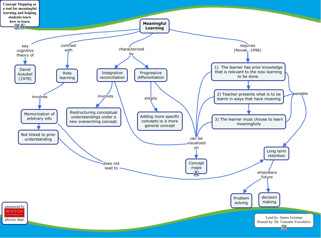 This Concept Map, created with IHMC CmapTools, has information related to: Meaningful Learning, Rote learning involves Not linked to prior understanding, 3) The learner must choose to learn meaningfully can be visualized on Concept maps, Memorization of arbitrary info does not lead to Long term retention, Progressive differentiation entails Adding more specific concepts to a more general concept, Meaningful Learning requires (Novak, 1998) 2) Teacher presents what is to be learnt in ways that have meaning, Long term retention empowers future Problem solving, Meaningful Learning key cognitive theory of David Ausubel (1978), Integrative reconciliation can be visualized on Concept maps, Meaningful Learning requires (Novak, 1998) 3) The learner must choose to learn meaningfully, Not linked to prior understanding does not lead to Long term retention, 3) The learner must choose to learn meaningfully enable Long term retention, Rote learning involves Memorization of arbitrary info, Meaningful Learning contrast with Rote learning, Integrative reconciliation involves Restructuring conceptual understandings under a new overarching concept., Meaningful Learning characterized by Progressive differentiation, 2) Teacher presents what is to be learnt in ways that have meaning enable Long term retention, Meaningful Learning characterized by Integrative reconciliation, Meaningful Learning requires (Novak, 1998) 1) The learner has prior knowledge that is relevant to the new learning to be done., 2) Teacher presents what is to be learnt in ways that have meaning can be visualized on Concept maps, Long term retention empowers future decision making