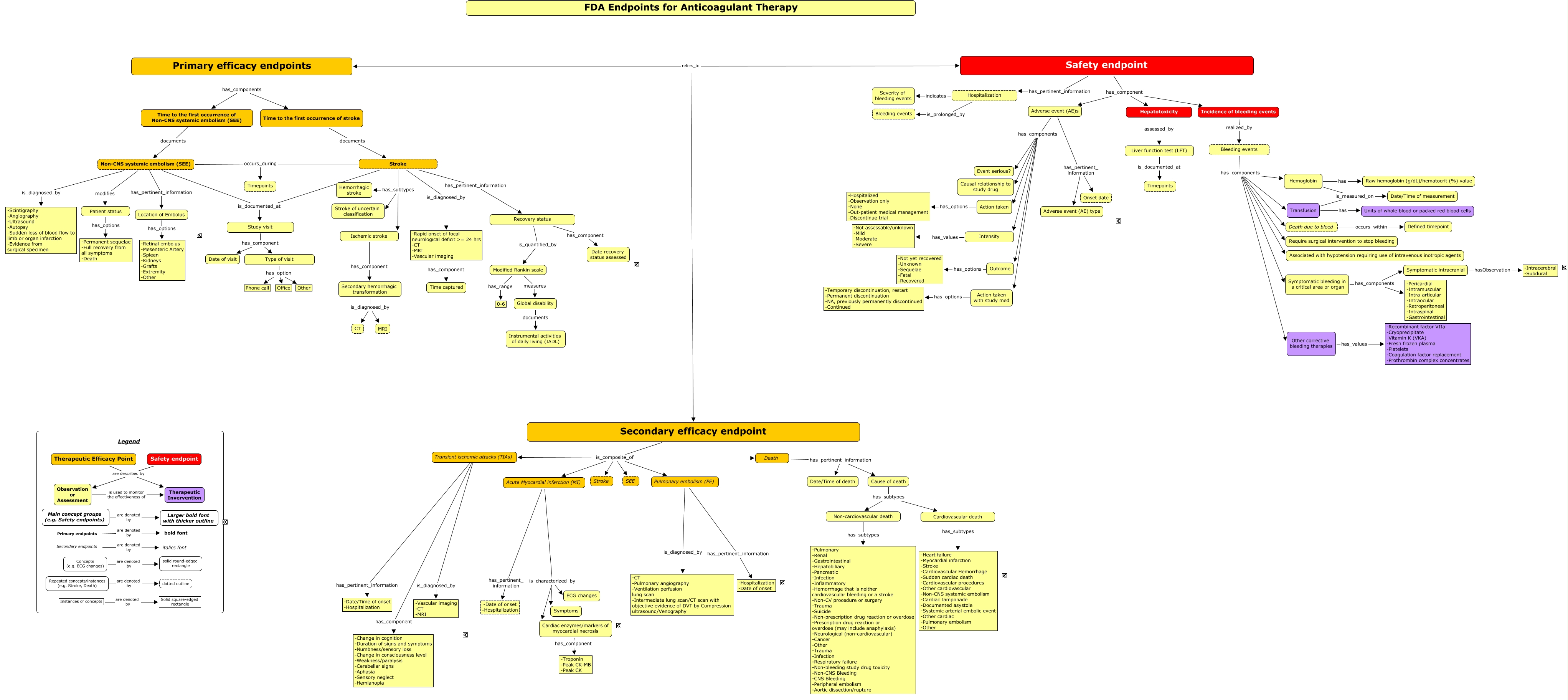 This Concept Map, created with IHMC CmapTools, has information related to: Anticoagulant_Master_CMAP_v9, Pulmonary embolism (PE) is_diagnosed_by -CT -Pulmonary angiography -Ventilation perfusion lung scan -Intermediate lung scan/CT scan with objective evidence of DVT by Compression ultrasound/Venography, Type of visit has_option Office, Modified Rankin scale measures Global disability, Cause of death has_subtypes Non-cardiovascular death, Death has_pertinent_information Date/Time of death, Stroke has_subtypes Hemorrhagic stroke, Bleeding events has_components Transfusion, Safety endpoint has_component Adverse event (AE)s, Patient status has_options -Permanent sequelae -Full recovery from all symptoms -Death, Stroke occurs_during Timepoints, Acute Myocardial infarction (MI) has_pertinent_ information -Date of onset -Hospitalization, Secondary hemorrhagic transformation is_diagnosed_by CT, Symptomatic intracranial hasObservation -Intracerebral -Subdural, Outcome has_options -Not yet recovered -Unknown -Sequelae -Fatal -Recovered, Adverse event (AE)s has_components Action taken, Adverse event (AE)s has_components Event serious?, Safety endpoint are described by Therapeutic Invervention, Study visit has_component Date of visit, Non-cardiovascular death has_subtypes -Pulmonary -Renal -Gastrointestinal -Hepatobiliary -Pancreatic -Infection -Inflammatory -Hemorrhage that is neither cardiovascular bleeding or a stroke -Non-CV procedure or surgery -Trauma -Suicide -Non-prescription drug reaction or overdose -Prescription drug reaction or overdose (may include anaphylaxis) -Neurological (non-cardiovascular) -Cancer -Other -Trauma -Infection -Respiratory failure -Non-bleeding study drug toxicity -Non-CNS Bleeding -CNS Bleeding -Peripheral embolism -Aortic dissection/rupture, Non-CNS systemic embolism (SEE) is_diagnosed_by -Scintigraphy -Angiography -Ultrasound -Autopsy -Sudden loss of blood flow to limb or organ infarction -Evidence from surgical specimen
