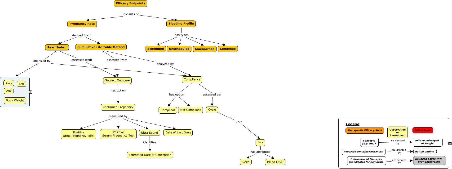 This Concept Map, created with IHMC CmapTools, has information related to: Contraceptives Efficacy Framework - v4-1, Bleeding Profile has types Amenorrhea, Confirmed Pregnancy measured by Positive Urine Pregnancy Test, Day has attributes Bleed, Bleeding Profile has types Unscheduled, Pregnancy Rate derived from Cumulative Life Table Method, Pearl Index assessed from Subject Outcome, Pearl Index analyzed by ????, Cycle ???? Day, Repeated concepts/instances are denoted by dotted outline, Concepts (e.g. BMI) are denoted by solid round-edged rectangle, Compliance has option Not Compliant, Pregnancy Rate derived from Pearl Index, Efficacy Endpoints consists of Bleeding Profile, Compliance assessed per Cycle, Cumulative Life Table Method assessed from Subject Outcome, Day has attributes Bleed Level, Ultra Sound identifies Estimated Date of Conception, Confirmed Pregnancy measured by Positive Serum Pregnancy Test, Bleeding Profile has types Scheduled, Pearl Index analyzed by Compliance