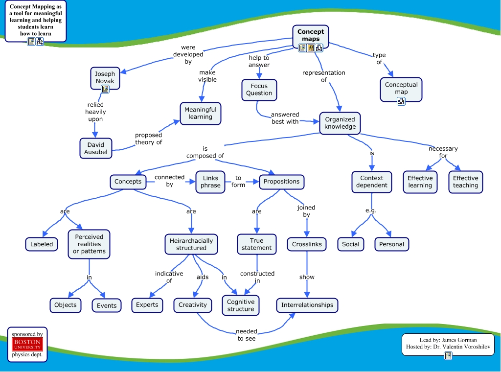 This Concept Map, created with IHMC CmapTools, has information related to: Concept Maps, Propositions joined by Crosslinks, Organized knowledge is composed of Propositions, Perceived realities or patterns in Objects, Concept maps make visible Meaningful learning, Concept maps type of Conceptual map, Organized knowledge necessary for Effective teaching, Organized knowledge is Context dependent, Organized knowledge is composed of Concepts, Organized knowledge necessary for Effective learning, Concepts are Heirarchacially structured, Heirarchacially structured in Cognitive structure, Concept maps were developed by Joseph Novak, Concept maps help to answer Focus Question, Perceived realities or patterns in Events, Focus Question answered best with Organized knowledge, Propositions are True statement, Joseph Novak relied heavily upon David Ausubel, David Ausubel proposed theory of Meaningful learning, Heirarchacially structured indicative of Experts, Heirarchacially structured aids Creativity