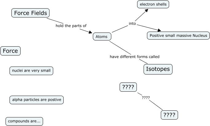 This Concept Map, created with IHMC CmapTools, has information related to: Atomic theory, Atoms into electron shells, Atoms into Positive small massive Nucleus, Atoms have different forms called Isotopes, Force Fields hold the parts of Atoms, ???? ???? ????