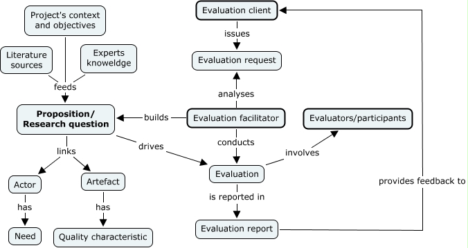 Este Cmap, tiene información relacionada con: Evaluation Model_JAISE, Literature sources feeds Proposition/ Research question, Proposition/ Research question links Actor, Evaluation is reported in Evaluation report, Proposition/ Research question links Artefact, Evaluation facilitator builds Proposition/ Research question, Proposition/ Research question drives Evaluation, Evaluation involves Evaluators/participants, Evaluation report provides feedback to Evaluation client, Actor has Need, Artefact has Quality characteristic, Experts knoweldge feeds Proposition/ Research question, Evaluation client issues Evaluation request, Evaluation facilitator conducts Evaluation, Project's context and objectives feeds Proposition/ Research question, Evaluation facilitator analyses Evaluation request