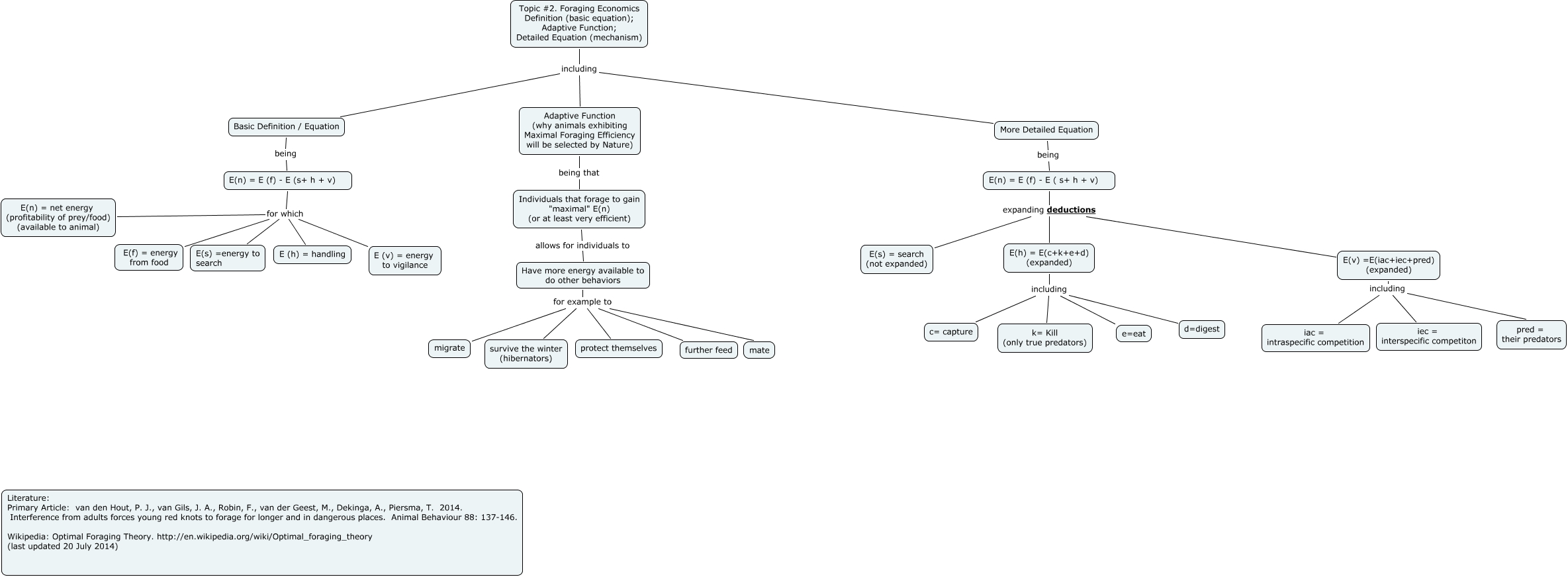 This Concept Map, created with IHMC CmapTools, has information related to: Topic 2. Foraging. Def AF Equations, Topic #2. Foraging Economics Definition (basic equation); Adaptive Function; Detailed Equation (mechanism) including Basic Definition / Equation, E(h) = E(c+k+e+d) (expanded) including k= Kill (only true predators), E(n) = E (f) - E ( s+ h + v) expanding deductions E(v) =E(iac+iec+pred) (expanded), Topic #2. Foraging Economics Definition (basic equation); Adaptive Function; Detailed Equation (mechanism) including More Detailed Equation, Individuals that forage to gain "maximal" E(n) (or at least very efficient) allows for individuals to Have more energy available to do other behaviors, E(v) =E(iac+iec+pred) (expanded) including iac = intraspecific competition, Have more energy available to do other behaviors for example to protect themselves, Have more energy available to do other behaviors for example to survive the winter (hibernators), Have more energy available to do other behaviors for example to mate, E(v) =E(iac+iec+pred) (expanded) including pred = their predators, E(n) = E (f) - E ( s+ h + v) expanding deductions E(h) = E(c+k+e+d) (expanded), E(n) = E (f) - E ( s+ h + v) expanding deductions E(s) = search (not expanded), E(n) = E (f) - E (s+ h + v) for which E (v) = energy to vigilance, E(h) = E(c+k+e+d) (expanded) including e=eat, E(n) = E (f) - E (s+ h + v) for which E(n) = net energy (profitability of prey/food) (available to animal), Topic #2. Foraging Economics Definition (basic equation); Adaptive Function; Detailed Equation (mechanism) including Adaptive Function (why animals exhibiting Maximal Foraging Efficiency will be selected by Nature), E(n) = E (f) - E (s+ h + v) for which E(s) =energy to search, E(h) = E(c+k+e+d) (expanded) including d=digest, Have more energy available to do other behaviors for example to migrate, More Detailed Equation being E(n) = E (f) - E ( s+ h + v)
