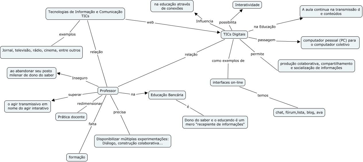 Esse mapa conceitual, produzido no IHMC CmapTools, tem a informação relacionada a: tecnologias, TICs Digitais relação Professor, TICs Digitais Influencia na educação através de conexões, TICs Digitais permite produção colaborativa, compartilhamento e socialização de informações, interfaces on-line temos chat, fórum,lista, blog, ava, TICs Digitais na Educação A aula continua na transmissão d e conteúdos, Tecnologias de Informação e Comunicação TICs web TICs Digitais, TICs Digitais como exemplos de interfaces on-line, Professor precisa Disponibilizar múltiplas experimentações: Diálogo, construção colaborativa..., Professor Inseguro ao abandonar seu posto milenar de dono do saber, Educação Bancária é Dono do saber e o educando é um mero "recepiente de informações", Tecnologias de Informação e Comunicação TICs exemplos Jornal, televisão, rádio, cinema, entre outros, TICs Digitais possibilita Interatividade, Tecnologias de Informação e Comunicação TICs relação Professor, TICs Digitais passagem computador pessoal (PC) para o computador coletivo, Professor redimensionar Prática docente, Professor na Educação Bancária, Professor falta formação, Professor superar o agir transmissivo em nome do agir interativo