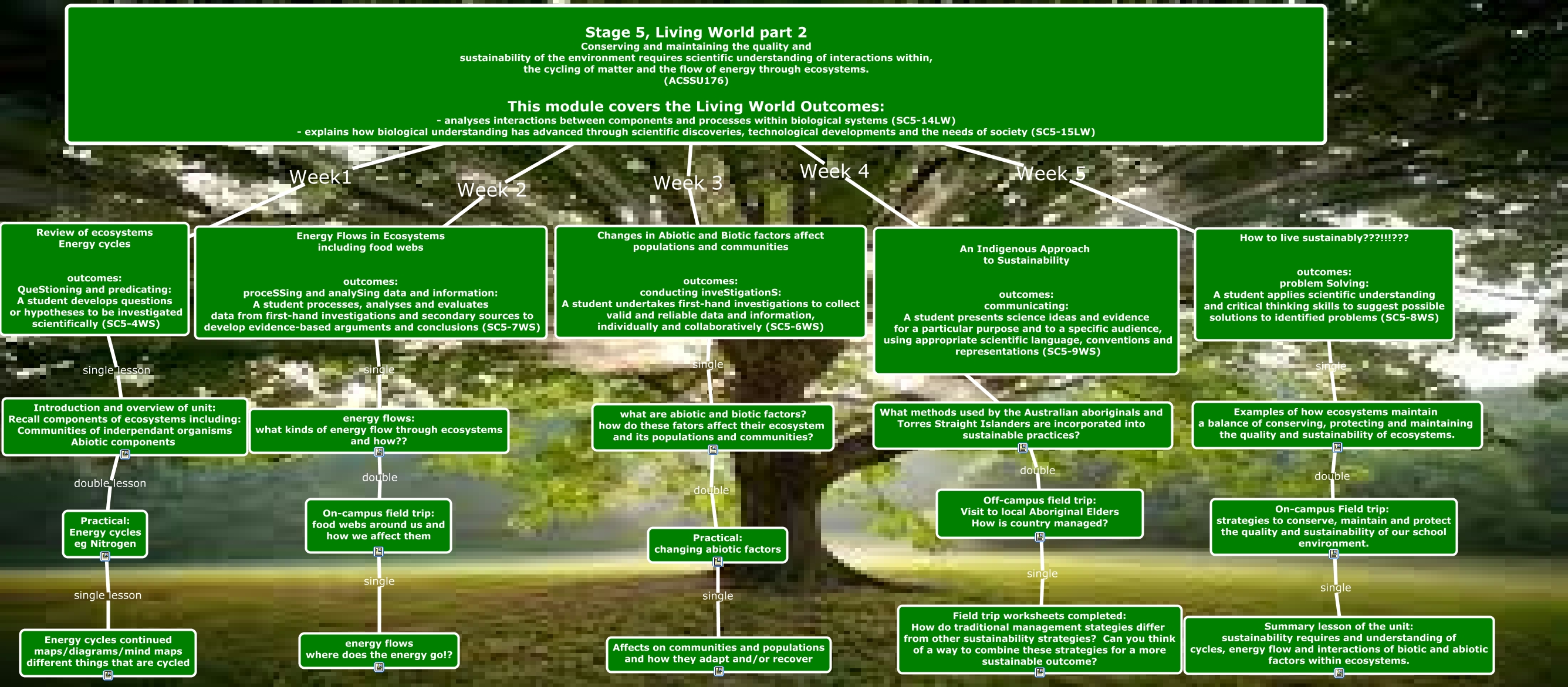 This Concept Map, created with IHMC CmapTools, has information related to: assignment 1 EDUC2152, Stage 5, Living World part 2 Conserving and maintaining the quality and sustainability of the environment requires scientific understanding of interactions within, the cycling of matter and the flow of energy through ecosystems. (ACSSU176) This module covers the Living World Outcomes: - analyses interactions between components and processes within biological systems (SC5-14LW) - explains how biological understanding has advanced through scientific discoveries, technological developments and the needs of society (SC5-15LW) Week 2 Energy Flows in Ecosystems including food webs outcomes: proceSSing and analySing data and information: A student processes, analyses and evaluates data from first-hand investigations and secondary sources to develop evidence-based arguments and conclusions (SC5-7WS), Introduction and overview of unit: Recall components of ecosystems including: Communities of inderpendant organisms Abiotic components double lesson Practical: Energy cycles eg Nitrogen, An Indigenous Approach to Sustainability outcomes: communicating: A student presents science ideas and evidence for a particular purpose and to a specific audience, using appropriate scientific language, conventions and representations (SC5-9WS) single What methods used by the Australian aboriginals and Torres Straight Islanders are incorporated into sustainable practices?, what are abiotic and biotic factors? how do these fators affect their ecosystem and its populations and communities? double Practical: changing abiotic factors, Stage 5, Living World part 2 Conserving and maintaining the quality and sustainability of the environment requires scientific understanding of interactions within, the cycling of matter and the flow of energy through ecosystems. (ACSSU176) This module covers the Living World Outcomes: - analyses interactions between components and processes within biological systems (SC5-14LW) - explains how biological understanding has advanced through scientific discoveries, technological developments and the needs of society (SC5-15LW) Week 4 An Indigenous Approach to Sustainability outcomes: communicating: A student presents science ideas and evidence for a particular purpose and to a specific audience, using appropriate scientific language, conventions and representations (SC5-9WS), On-campus Field trip: strategies to conserve, maintain and protect the quality and sustainability of our school environment. single Summary lesson of the unit: sustainability requires and understanding of cycles, energy flow and interactions of biotic and abiotic factors within ecosystems., How to live sustainably???!!!??? outcomes: problem Solving: A student applies scientific understanding and critical thinking skills to suggest possible solutions to identified problems (SC5-8WS) single Examples of how ecosystems maintain a balance of conserving, protecting and maintaining the quality and sustainability of ecosystems., What methods used by the Australian aboriginals and Torres Straight Islanders are incorporated into sustainable practices? double Off-campus field trip: Visit to local Aboriginal Elders How is country managed?, Examples of how ecosystems maintain a balance of conserving, protecting and maintaining the quality and sustainability of ecosystems. double On-campus Field trip: strategies to conserve, maintain and protect the quality and sustainability of our school environment., Practical: Energy cycles eg Nitrogen single lesson Energy cycles continued maps/diagrams/mind maps different things that are cycled, Practical: changing abiotic factors single Affects on communities and populations and how they adapt and/or recover, Stage 5, Living World part 2 Conserving and maintaining the quality and sustainability of the environment requires scientific understanding of interactions within, the cycling of matter and the flow of energy through ecosystems. (ACSSU176) This module covers the Living World Outcomes: - analyses interactions between components and processes within biological systems (SC5-14LW) - explains how biological understanding has advanced through scientific discoveries, technological developments and the needs of society (SC5-15LW) Week1 Review of ecosystems Energy cycles outcomes: QueStioning and predicating: A student develops questions or hypotheses to be investigated scientifically (SC5-4WS), Changes in Abiotic and Biotic factors affect populations and communities outcomes: conducting inveStigationS: A student undertakes first-hand investigations to collect valid and reliable data and information, individually and collaboratively (SC5-6WS) single what are abiotic and biotic factors? how do these fators affect their ecosystem and its populations and communities?, Stage 5, Living World part 2 Conserving and maintaining the quality and sustainability of the environment requires scientific understanding of interactions within, the cycling of matter and the flow of energy through ecosystems. (ACSSU176) This module covers the Living World Outcomes: - analyses interactions between components and processes within biological systems (SC5-14LW) - explains how biological understanding has advanced through scientific discoveries, technological developments and the needs of society (SC5-15LW) Week 5 How to live sustainably???!!!??? outcomes: problem Solving: A student applies scientific understanding and critical thinking skills to suggest possible solutions to identified problems (SC5-8WS), Off-campus field trip: Visit to local Aboriginal Elders How is country managed? single Field trip worksheets completed: How do traditional management stategies differ from other sustainability strategies? Can you think of a way to combine these strategies for a more sustainable outcome?, Review of ecosystems Energy cycles outcomes: QueStioning and predicating: A student develops questions or hypotheses to be investigated scien