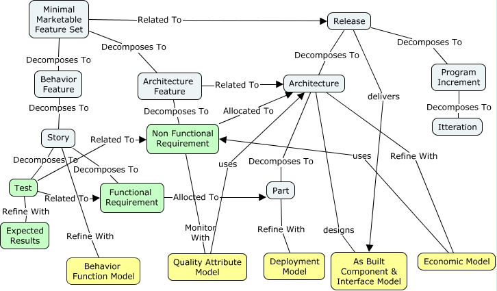 This Concept Map, created with IHMC CmapTools, has information related to: MBSE Agile Hierarchy, Release delivers As Built Component & Interface Model, Architecture designs As Built Component & Interface Model, Part Refine With Deployment Model, Minimal Marketable Feature Set Related To Release, Non Functional Requirement Monitor With Quality Attribute Model, Program Increment Decomposes To Itteration, Architecture Decomposes To Part, Architecture Feature Decomposes To Non Functional Requirement, Release Decomposes To Architecture, Architecture Feature Related To Architecture, Release Decomposes To Program Increment, Architecture Refine With Economic Model, Economic Model uses Non Functional Requirement, Story Decomposes To Test, Behavior Feature Decompses To Story, Minimal Marketable Feature Set Decomposes To Behavior Feature, Quality Attribute Model uses Architecture, Test Related To Functional Requirement, Minimal Marketable Feature Set Decomposes To Architecture Feature, Story Refine With Behavior Function Model