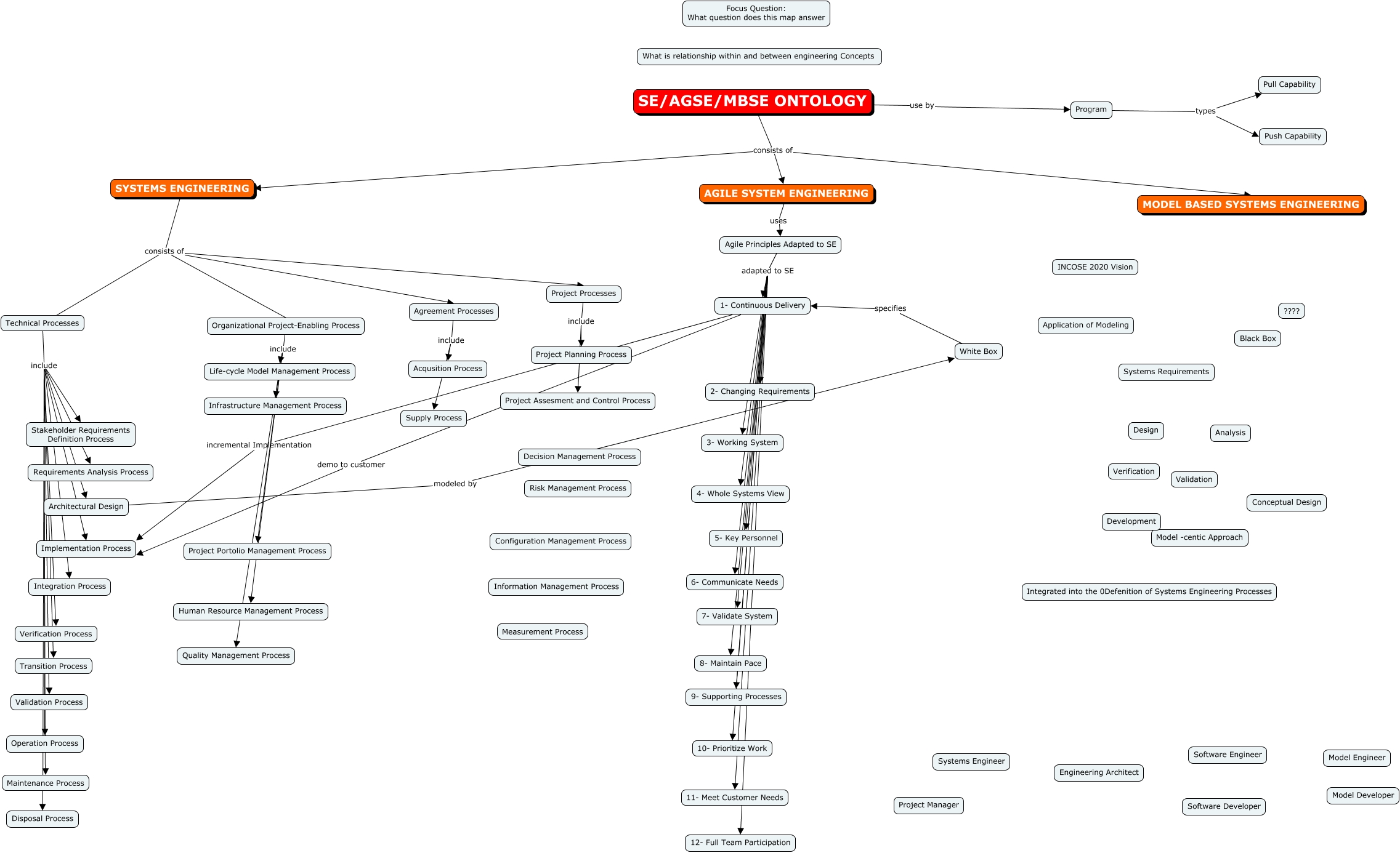 This Concept Map, created with IHMC CmapTools, has information related to: OLD Framework Ontology, Organizational Project-Enabling Process include Quality Management Process, SE/AGSE/MBSE ONTOLOGY consists of SYSTEMS ENGINEERING, Technical Processes include Maintenance Process, Project Processes include Project Assesment and Control Process, Organizational Project-Enabling Process include Infrastructure Management Process, SYSTEMS ENGINEERING consists of Project Processes, SYSTEMS ENGINEERING consists of Technical Processes, Agile Principles Adapted to SE adapted to SE 11- Meet Customer Needs, Agile Principles Adapted to SE adapted to SE 7- Validate System, Architectural Design modeled by White Box, Organizational Project-Enabling Process include Project Portolio Management Process, Agile Principles Adapted to SE adapted to SE 4- Whole Systems View, Agile Principles Adapted to SE adapted to SE 8- Maintain Pace, Organizational Project-Enabling Process include Life-cycle Model Management Process, Technical Processes include Integration Process, 1- Continuous Delivery incremental Implementation Implementation Process, White Box specifies 1- Continuous Delivery, Agile Principles Adapted to SE adapted to SE 10- Prioritize Work, Project Processes include Project Planning Process, Technical Processes include Verification Process