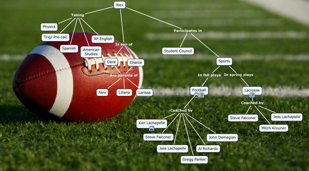 This Concept Map, created with IHMC CmapTools, has information related to: Who am I Cmap, Dara Are parents of Larissa, Football Coached by Al Richards, Football Coached by Jess Lachapelle, Football Coached by Steve Falconer, Alex Taking Trig/ Pre-calc, Football Coached by Ken Lachapelle, Charlie Are parents of Liliana, Lacrosse Coached by Mitch Krouner, Dara Are parents of Alex, Dara Are parents of Liliana, Alex Is son of Dara, Alex Is son of Charlie, Football Coached by Gregg Parker, Charlie Are parents of Larissa, Alex Taking Physics, Alex Taking AP English, Football Coached by John Demagian, Sports In spring plays Lacrosse, Sports In fall plays Football, Alex Participates in Sports