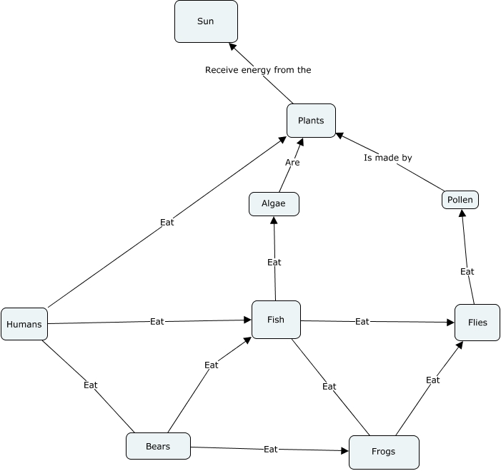 This Concept Map, created with IHMC CmapTools, has information related to: Ye Old Guac Gang Food Web 2.0, Humans Eat Fish, Flies Eat Pollen, Plants Receive energy from the Sun, Frogs Eat Flies, Fish Eat Flies, Bears Eat Frogs, Algae Are Plants, Bears Eat Fish, Humans Eat Bears, Humans Eat Plants, Fish Eat Algae, Pollen Is made by Plants, Fish Eat Frogs