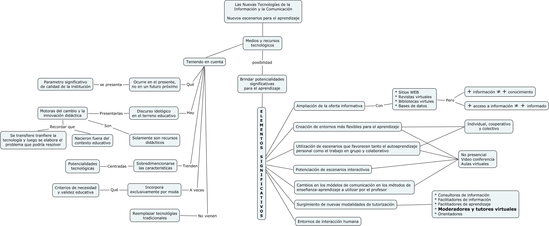 Este Cmap, tiene información relacionada con: TICs Rodrigo _v2, * Sitios WEB * Revistas virtuales * Bibliotecas virtules * Bases de datos Con Ampliación de la oferta informativa, Las Nuevas Tecnologías de la Información y la Comunicación Nuevos escenarios para el aprendizaje ???? Medios y recursos tecnológicos, Motoras del cambio y la innovación didáctica Son Solamente son recursos didácticos, Surgimiento de nuevas modalidades de tutorización ???? * Consultores de información * Facilitadores de información * Facilitadores de aprendizaje * Moderadores y tutores virtuales * Orientadores, Ocurre en el presente, no en un futuro próximo Qué Teniendo en cuenta, E L E M E N T O S S I G N I F I C A T I V O S ???? Utilización de escenarios que favorecen tanto el autoaprendizaje personal como el trabajo en grupo y colaborativo, Incorpora exclusivamente por moda A veces Teniendo en cuenta, Creación de entornos más flexibles para el aprendizaje ???? No presencial Video conferencia Aulas virtuales, Brindar potencialidades significativas para el aprendizaje ???? E L E M E N T O S S I G N I F I C A T I V O S, Medios y recursos tecnológicos ???? Teniendo en cuenta, Teniendo en cuenta Tienden Sobredimencionarse las caracteristicas, Motoras del cambio y la innovación didáctica Presentarlas Discurso idelógico en el terreno educativo, E L E M E N T O S S I G N I F I C A T I V O S ???? Potenciación de escenarios interactivos, E L E M E N T O S S I G N I F I C A T I V O S ???? Creación de entornos más flexibles para el aprendizaje, Utilización de escenarios que favorecen tanto el autoaprendizaje personal como el trabajo en grupo y colaborativo ???? No presencial Video conferencia Aulas virtuales, Se transfiere tranfiere la tecnología y luego se elabora el problema que podría resolver Recordar que Motoras del cambio y la innovación didáctica, Brindar potencialidades significativas para el aprendizaje posibilidad Medios y recursos tecnológicos, Se transfiere tranfiere la tecnología y luego se elabora el problema que podría resolver Recordar que Nacieron fuera del contexto educativo, Reemplazar tecnológias tradicionales No vienen Teniendo en cuenta, Potenciación de escenarios interactivos Permitirá No presencial Video conferencia Aulas virtuales