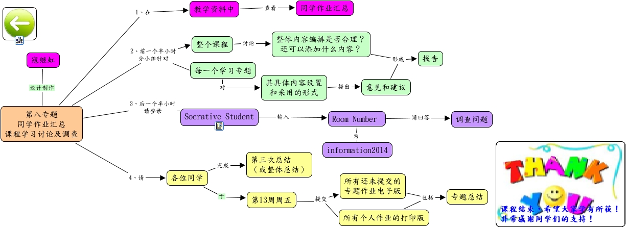 此概念图以 IHMC CmapTools 创建, 内含信息有关于: 第八专题 课程学习讨论与调查, 整体内容编排是否合理? 还可以添加什么内容? 形成 报告, 第八专题 同学作业汇总 课程学习讨论及调查 3、后一个半小时 请登录 Socrative Student, 各位同学 于 第13周周五, 第八专题 同学作业汇总 课程学习讨论及调查 4、请 各位同学, Socrative Student 输入 Room Number, 第13周周五 提交 所有个人作业的打印版, 第八专题 同学作业汇总 课程学习讨论及调查 2、前一个半小时 分小组针对 整个课程, 教学资料中 查看 同学作业汇总, 第13周周五 提交 所有还未提交的 专题作业电子版, 所有个人作业的打印版 包括 专题总结, Room Number 请回答 调查问题, 其具体内容设置 和采用的形式 提出 意见和建议, 所有还未提交的 专题作业电子版 包括 专题总结, 第八专题 同学作业汇总 课程学习讨论及调查 2、前一个半小时 分小组针对 每一个学习专题, Room Number 为 information2014, 第八专题 同学作业汇总 课程学习讨论及调查 1、在 教学资料中, 各位同学 完成 第三次总结 (或整体总结), 每一个学习专题 对 其具体内容设置 和采用的形式, 整个课程 讨论 整体内容编排是否合理? 还可以添加什么内容?, 意见和建议 形成 报告