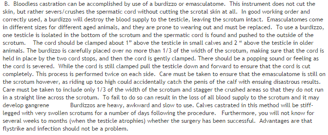 0208_Castration.pdf 5 Station Physical Examination of cattle.url adv and disadv.jpg Advantages and Disadvantages of open closed castration.url adverse effects.jpg Aftercare for castrated gelding.jpg Age.jpg Analgesia and anaesthesia.url Animal Welfare Approved Technical Advice Fact Sheet No. 9.pdf Article contains pictures and instructions.url Article on the reversal for Xylazine.url ASA Grading System.url Assessment of pain in ruminants.url Atropine.jpg Banamine.jpg Banamine.docx banding.jpg Banding video.url Barnes Dehorner.jpg beef_castrateNational Department of Agriculture.pdf Beef-Castration-Factsheet-2007- Pain and Stress.pdf Bovine ascultation (video).url Bovine Physical Examination (video).url Buck- Burdizzo.url bull_tract.jpg bullfighter.jpg bull repro tract.jpg burdizoo crush sites.jpg burdizzo.jpg burdizzo check.jpg Burdizzo method.png Burdizzo open position.jpg Burdizzo Technique.url Calf disbudding (video).url Calicrate bander (video).url callicrate bander.jpg Cardiac Resuscitation.url Castration_Instrustments-burdizzo-sizes.jpg castration-cattle-bgnd.pdf Castration methods.url Castration- of- animals--staggered sites.gif Castration- UofT pdf.pdf Cattle dehorning methods - extensive.url Cattle Feeding Space.jpg Chemical Castration.url Chemical castration in cattle.url Chemical Castration in Horses.url Chemical dehorning (video).url Chemical dehorning in calves.url Chemical dehorning procedure.url Chemical disbudding in calves video.url Combats the bradycardia effects from Xylazine.url Combi-kel 40.docx Combi-kel 40.jpeg Complications after ringing.jpg Dehorned.jpg Dehorning.JPG Dehorning and Castration.JPG DEHORNING AND CASTRATION.cmap Dehorning dilemmas.url Dehorning in calves.url Dehorning methods.url Dehorning via Calicrate bander.url Disbudder.jpg Disbudding vs Dehorning.url Document outlining various reversal drugs for anaesthesia.url Downer cow.url download.jpg Drug Protocol for castration and dehorning.jpg Elastic Band Castration in calves.url emasculator.jpg emasculator diagram.png emasculator method.jpg Epinephrine.jpg Equine Castration Complications How to Treat Them.pdf Equine Review.pdf examining the scrotum.jpg Examples of Sedative, Anaesthetic, and Pain Management Protocols for Healthy Horses, Cattle, and Swine.url Gigli Wire and Handles.jpg Handling & Restraint of Farm Animals.url Handling and Restraint.JPG Herd Aggression (video).url Herd Mates Cartoon.jpg Hot Iron.jpg immunocastration.jpg kid.jpg larvacid.jpg Larvicid (Screw Worm) aerosol spray.url Lateral Recumbency.jpg Legislature in England.jpg Lidocaine.docx Lidocaine.url Lidocaine 2 percent.jpg lidocaine for closed.jpg Local anesthesia in cattle.url Mechanical Dehorning methods.url Methods of castration.url Methods of Dehorning.url Nerve block.url Open castration on a bul.url open method.jpg Operating Instructions for Calicrate Bander for castration (video).url outrun.jpg Physical Examination of cattle.jpg position of banding.jpg Possible complications in dehorning calves.url Postop infection.jpg Postop pain.jpg reasons for castration.jpg Recognition of pain in cattle.jpg Restraint.jpg Restraint for bull castration.jpg Reversal of Xylazine by Tolazoline.url rubber ring both testes.jpg Sale value.jpg short scrotum method.jpg short scrotum method in sheep.jpg TAFS-10-Sheep-Castration.pdf Technique to administering local anaesthetic to calves - Cornual nerve block.url terms.jpg Tetravet.jpg The Downer Cow.url theshortscrotummethodofcastrationinlambs_210710_final_report.pdf Tolazoline.jpg Untitled.cmap Use of emasculator.url Web Flunixin meglumine.url Web Lidocaine.url Web Xylazine.url When are calves castrated.url Why dehorn cattle.url Xylazine.docx Xylazine 2 percent.jpg
