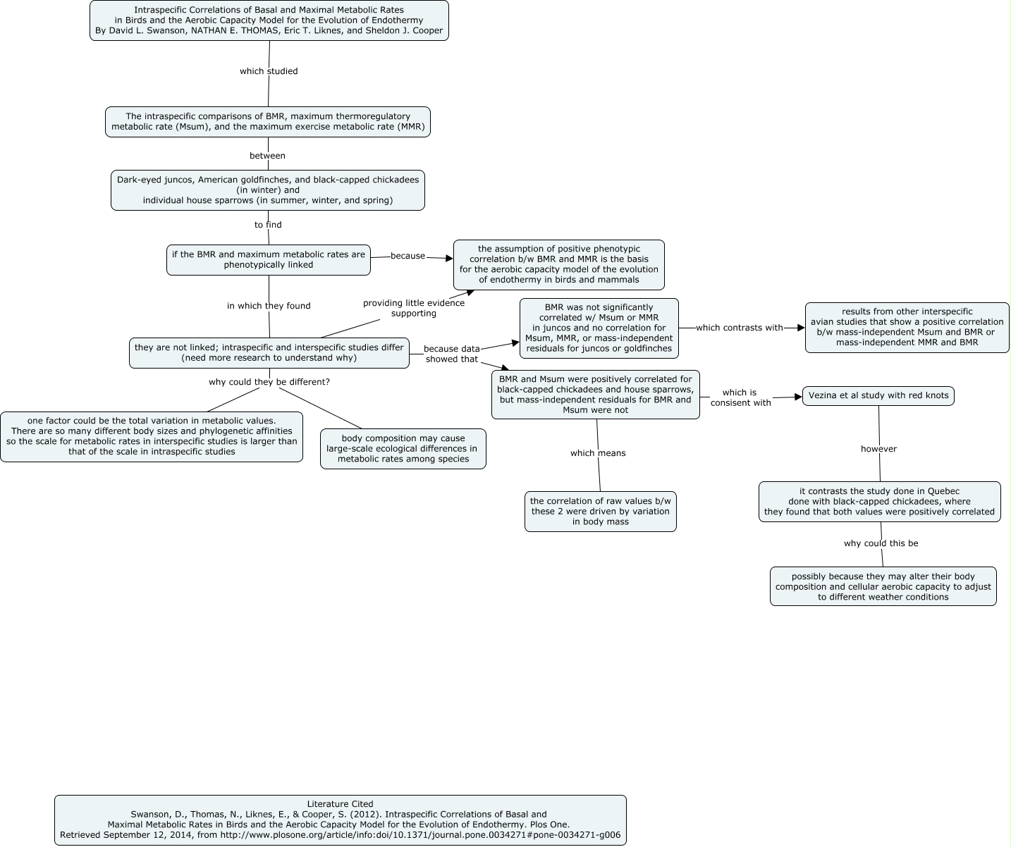 This Concept Map, created with IHMC CmapTools, has information related to: CMap 2 (Basal & Metabolic Rates in Birds by NE Thomas), BMR was not significantly correlated w/ Msum or MMR in juncos and no correlation for Msum, MMR, or mass-independent residuals for juncos or goldfinches which contrasts with results from other interspecific avian studies that show a positive correlation b/w mass-independent Msum and BMR or mass-independent MMR and BMR, they are not linked; intraspecific and interspecific studies differ (need more research to understand why) why could they be different? one factor could be the total variation in metabolic values. There are so many different body sizes and phylogenetic affinities so the scale for metabolic rates in interspecific studies is larger than that of the scale in intraspecific studies, BMR and Msum were positively correlated for black-capped chickadees and house sparrows, but mass-independent residuals for BMR and Msum were not which is consisent with Vezina et al study with red knots, Vezina et al study with red knots however it contrasts the study done in Quebec done with black-capped chickadees, where they found that both values were positively correlated, Intraspecific Correlations of Basal and Maximal Metabolic Rates in Birds and the Aerobic Capacity Model for the Evolution of Endothermy By David L. Swanson, NATHAN E. THOMAS, Eric T. Liknes, and Sheldon J. Cooper which studied The intraspecific comparisons of BMR, maximum thermoregulatory metabolic rate (Msum), and the maximum exercise metabolic rate (MMR), it contrasts the study done in Quebec done with black-capped chickadees, where they found that both values were positively correlated why could this be possibly because they may alter their body composition and cellular aerobic capacity to adjust to different weather conditions, they are not linked; intraspecific and interspecific studies differ (need more research to understand why) because data showed that BMR was not significantly correlated w/ Msum or MMR in juncos and no correlation for Msum, MMR, or mass-independent residuals for juncos or goldfinches, they are not linked; intraspecific and interspecific studies differ (need more research to understand why) providing little evidence supporting the assumption of positive phenotypic correlation b/w BMR and MMR is the basis for the aerobic capacity model of the evolution of endothermy in birds and mammals, if the BMR and maximum metabolic rates are phenotypically linked because the assumption of positive phenotypic correlation b/w BMR and MMR is the basis for the aerobic capacity model of the evolution of endothermy in birds and mammals, if the BMR and maximum metabolic rates are phenotypically linked in which they found they are not linked; intraspecific and interspecific studies differ (need more research to understand why), BMR and Msum were positively correlated for black-capped chickadees and house sparrows, but mass-independent residuals for BMR and Msum were not which means the correlation of raw values b/w these 2 were driven by variation in body mass, Dark-eyed juncos, American goldfinches, and black-capped chickadees (in winter) and individual house sparrows (in summer, winter, and spring) to find if the BMR and maximum metabolic rates are phenotypically linked, they are not linked; intraspecific and interspecific studies differ (need more research to understand why) because data showed that BMR and Msum were positively correlated for black-capped chickadees and house sparrows, but mass-independent residuals for BMR and Msum were not, they are not linked; intraspecific and interspecific studies differ (need more research to understand why) why could they be different? body composition may cause large-scale ecological differences in metabolic rates among species, The intraspecific comparisons of BMR, maximum thermoregulatory metabolic rate (Msum), and the maximum exercise metabolic rate (MMR) between Dark-eyed juncos, American goldfinches, and black-capped chickadees (in winter) and individual house sparrows (in summer, winter, and spring)