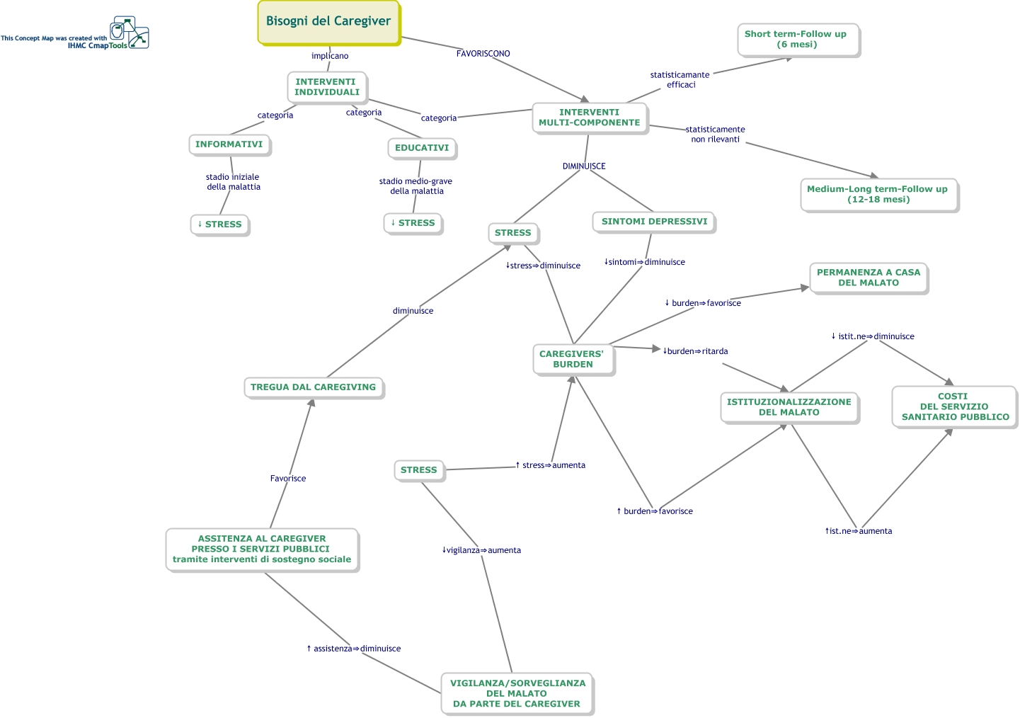 Questa Cmap, creata con IHMC CmapTools, contiene informazioni relative a: Mappa concettuale_tesi_infermieristica, ASSITENZA AL CAREGIVER PRESSO I SERVIZI PUBBLICI tramite interventi di sostegno sociale Favorisce TREGUA DAL CAREGIVING, STRESS ↓stress⇒diminuisce CAREGIVERS' BURDEN, INTERVENTI INDIVIDUALI categoria EDUCATIVI, INFORMATIVI stadio iniziale della malattia ↓ STRESS, VIGILANZA/SORVEGLIANZA DEL MALATO DA PARTE DEL CAREGIVER ↓vigilanza⇒aumenta STRESS, EDUCATIVI stadio medio-grave della malattia ↓ STRESS, ISTITUZIONALIZZAZIONE DEL MALATO ↑ist.ne⇒aumenta COSTI DEL SERVIZIO SANITARIO PUBBLICO, SINTOMI DEPRESSIVI ↓sintomi⇒diminuisce CAREGIVERS' BURDEN, STRESS ↑ stress⇒aumenta CAREGIVERS' BURDEN, INTERVENTI MULTI-COMPONENTE DIMINUISCE STRESS, INTERVENTI INDIVIDUALI categoria INTERVENTI MULTI-COMPONENTE, Bisogni del Caregiver FAVORISCONO INTERVENTI MULTI-COMPONENTE, INTERVENTI MULTI-COMPONENTE DIMINUISCE SINTOMI DEPRESSIVI, ISTITUZIONALIZZAZIONE DEL MALATO ↓ istit.ne⇒diminuisce COSTI DEL SERVIZIO SANITARIO PUBBLICO, CAREGIVERS' BURDEN ↓burden⇒ritarda ISTITUZIONALIZZAZIONE DEL MALATO, ASSITENZA AL CAREGIVER PRESSO I SERVIZI PUBBLICI tramite interventi di sostegno sociale ↑ assistenza⇒diminuisce VIGILANZA/SORVEGLIANZA DEL MALATO DA PARTE DEL CAREGIVER, INTERVENTI MULTI-COMPONENTE statisticamante efficaci Short term-Follow up (6 mesi), INTERVENTI MULTI-COMPONENTE statisticamente non rilevanti Medium-Long term-Follow up (12-18 mesi), CAREGIVERS' BURDEN ↓ burden⇒favorisce PERMANENZA A CASA DEL MALATO, CAREGIVERS' BURDEN ↑ burden⇒favorisce ISTITUZIONALIZZAZIONE DEL MALATO