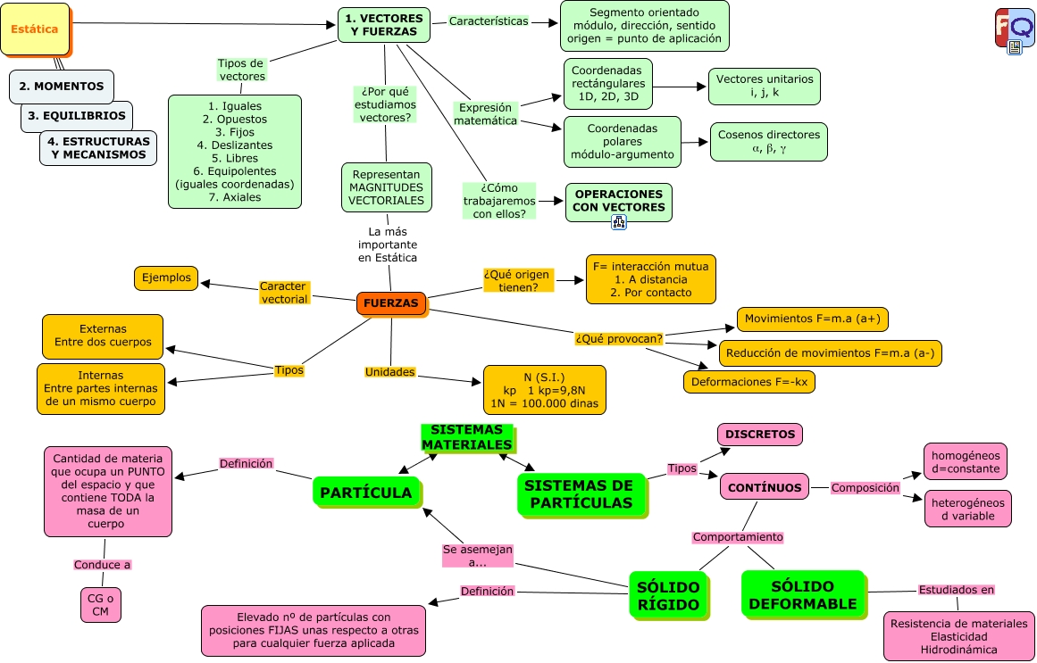 1N = 100.000 dinas </mtext> </mrow> </math>, Estática ???? 2. MOMENTOS, Coordenadas polares módulo-argumento ???? Cosenos directores α, β, γ, FUERZAS ¿Qué provocan? Movimientos F=m.a (a+), SÓLIDO RÍGIDO Definición Elevado nº de partículas con posiciones FIJAS unas respecto a otras para cualquier fuerza aplicada, Cantidad de materia que ocupa un PUNTO del espacio y que contiene TODA la masa de un cuerpo Conduce a CG o CM, Representan MAGNITUDES VECTORIALES La más importante en Estática FUERZAS, 1. VECTORES Y FUERZAS Expresión matemática Coordenadas rectángulares 1D, 2D, 3D, 1. VECTORES Y FUERZAS Características Segmento orientado módulo, dirección, sentido origen = punto de aplicación, Coordenadas rectángulares 1D, 2D, 3D ???? Vectores unitarios i, j, k, SÓLIDO DEFORMABLE Estudiados en Resistencia de materiales Elasticidad Hidrodinámica, PARTÍCULA Definición Cantidad de materia que ocupa un PUNTO del espacio y que contiene TODA la masa de un cuerpo, SISTEMAS DE PARTÍCULAS Tipos CONTÍNUOS, FUERZAS Tipos Externas Entre dos cuerpos