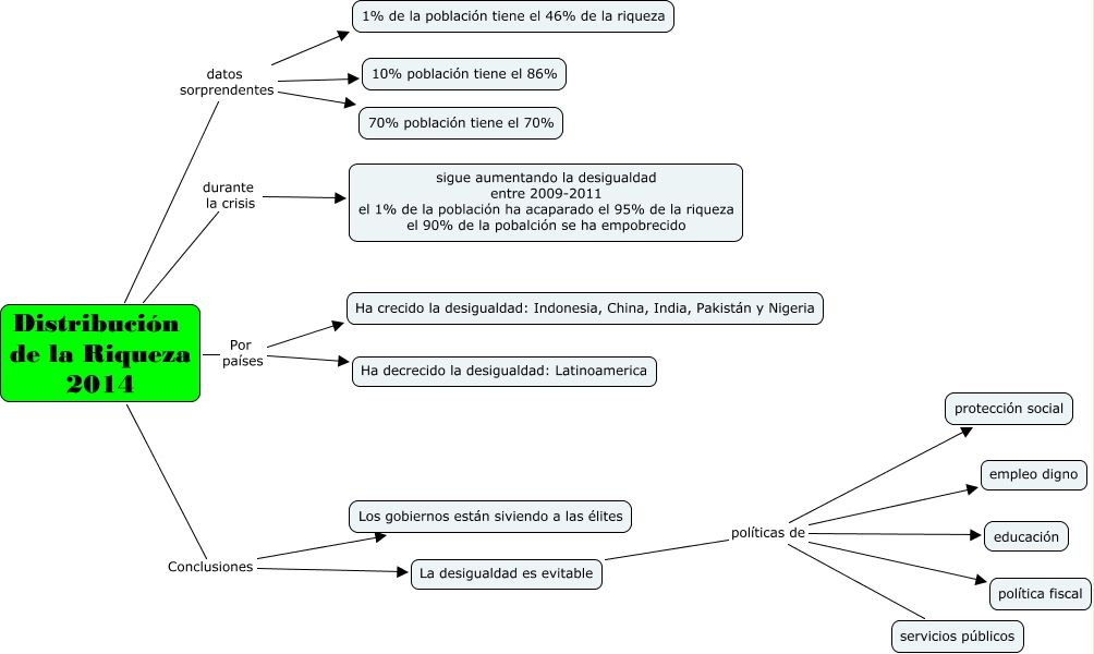 Este Cmap, tiene información relacionada con: desigualdad de la riqueza, Distribución de la Riqueza 2014 durante la crisis sigue aumentando la desigualdad entre 2009-2011 el 1% de la población ha acaparado el 95% de la riqueza el 90% de la pobalción se ha empobrecido, Distribución de la Riqueza 2014 datos sorprendentes 10% población tiene el 86%, La desigualdad es evitable políticas de empleo digno, Distribución de la Riqueza 2014 Conclusiones La desigualdad es evitable, Distribución de la Riqueza 2014 Por países Ha decrecido la desigualdad: Latinoamerica, Distribución de la Riqueza 2014 Por países Ha crecido la desigualdad: Indonesia, China, India, Pakistán y Nigeria, Distribución de la Riqueza 2014 datos sorprendentes 70% población tiene el 70%, La desigualdad es evitable políticas de política fiscal, La desigualdad es evitable políticas de educación, Distribución de la Riqueza 2014 datos sorprendentes 1% de la población tiene el 46% de la riqueza, La desigualdad es evitable políticas de protección social, La desigualdad es evitable políticas de servicios públicos, Distribución de la Riqueza 2014 Conclusiones Los gobiernos están siviendo a las élites