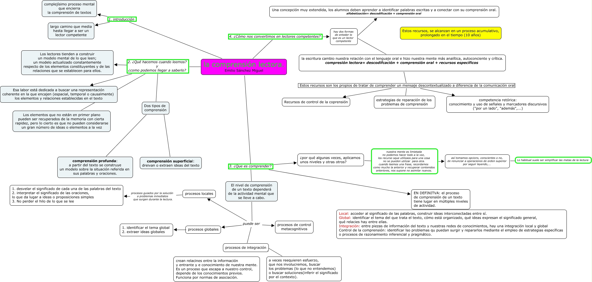 Este Cmap, tiene información relacionada con: la comprensiónlectora, El nivel de comprensión de un texto dependerá de la actividad mental que se lleve a cabo. puede ser procesos de integración, procesos de integración, la escritura cambio nuestra relación con el lenguaje oral e hizo nuestra mente más analítica, autoconciente y crítica. compresión lectora= descodifcación + comprensión oral + recursos específicos Estos recursos son los propios de tratar de comprender un mensaje descontextualizado a diferencia de la comunicación oral Recursos de control de la coprensión, la comprensión lectora. Emilio Sánchez Miguel 3. ¿Que es comprender? EN DEFINITVA: el proceso de comprensión de un texto tiene lugar en múltiples niveles de actividad., la comprensión lectora. Emilio Sánchez Miguel 2. ¿Qué hacemos cuando leemos? y ¿como podemos llegar a saberlo? Dos tipos de comprensión, la comprensión lectora. Emilio Sánchez Miguel 4. ¿Cómo nos convertimos en lectores competentes? hay dos formas de enteder lo que es un lector competente, la comprensión lectora. Emilio Sánchez Miguel 2. ¿Qué hacemos cuando leemos? y ¿como podemos llegar a saberlo? Los elementos que no están en primer plano pueden ser recuperados de la memoria con cierta rapidez, pero lo cierto es que no pueden considerarse un gran número de ideas o elementos a la vez, la escritura cambio nuestra relación con el lenguaje oral e hizo nuestra mente más analítica, autoconciente y crítica. compresión lectora= descodifcación + comprensión oral + recursos específicos Estos recursos son los propios de tratar de comprender un mensaje descontextualizado a diferencia de la comunicación oral estrategias de reparación de los problemas de comprensión, Dos tipos de comprensión ???? comprensión superficial: dreivan o extraen ideas del texto, Dos tipos de comprensión ???? comprensión profunda: a partir del texto se construye un modelo sobre la situación referida en sus palabras y oraciones., así tomamos opcions, conscientes o no, de renunciar a operaciones de orden superior por seguir leyendo,... Lo habitual suele ser simplificar las metas de la lectura, la comprensión lectora. Emilio Sánchez Miguel 3. ¿Que es comprender? ¿por qué algunas veces, aplicamos unos niveles y otras otros?, la comprensión lectora. Emilio Sánchez Miguel 2. ¿Qué hacemos cuando leemos? y ¿como podemos llegar a saberlo? Los lectores tienden a construir un modelo mental de lo que leen; un modelo actualizado constantemente respecto de los elementos constituyentes y de las relaciones que se establecen para ellos., El nivel de comprensión de un texto dependerá de la actividad mental que se lleve a cabo. puede ser procesos locales, hay dos formas de enteder lo que es un lector competente la escritura cambio nuestra relación con el lenguaje oral e hizo nuestra mente más analítica, autoconciente y crítica. compresión lectora= descodifcación + comprensión oral + recursos específicos, la escritura cambio nuestra relación con el lenguaje oral e hizo nuestra mente más analítica, autoconciente y crítica. compresión lectora= descodifcación + comprensión oral + recursos específicos Estos recursos son los propios de tratar de comprender un mensaje descontextualizado a diferencia de la comunicación oral competencia retórica: conocimiento y uso de señales y marcadores discursivos ("por un lado", "además",...), la comprensión lectora. Emilio Sánchez Miguel 3. ¿Que es comprender? El nivel de comprensión de un texto dependerá de la actividad mental que se lleve a cabo., procesos de integración a veces reequieren esfuerzo, que nos involucremos, buscar los problemas (lo que no entendemos) o buscar soluciones(inferir el significado por el contexto)., hay dos formas de enteder lo que es un lector competente Una concepción muy extendida, los alumnos deben aprender a identificar palabras escritas y a conectar con su comprensión oral. alfabetización= descodificación + comprensión oral, procesos locales procesos guiados por la solución a problemas inmediatos que surgen durante la lectura. 1. desvelar el significado de cada una de las palabras del texto 2. interpretar el significado de las oraciones, lo que da lugar a ideas o proposiciones simples 3. No perder el hilo de lo que se lee