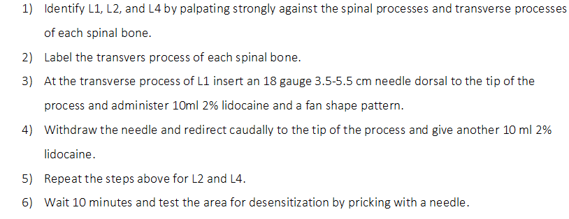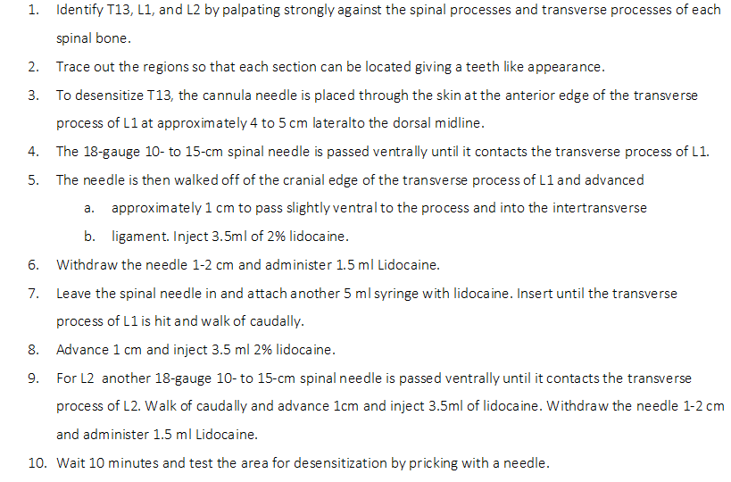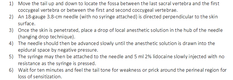 BCS-entire chart.jpg BCS-schematic.jpg Calculating drug doses.png Caudal Epidural (includes dosage for ovine).png Client Communication.url Distal Paravetebral Block (includes Dosage For Cattle).png Epidural block video.url Full details on General Anaesthesia.url Guidelines for the Use of Anesthetics, Analgesics and Tranquilizers in Laboratory Mammals.url Illustartion of Inverted L. Block.png Intravenous Limb Anaesthesia.png Intravenous regional anaesthesia.url IO Note.png Lateral Saphenous Regional Block.png Local Anesthetics - physical, chemical and pharmacodynamic properties.png Locoregional Anaesthesia (LA).png Monitoring protocol.url Paravertebral blocks.url Paravertebral nerve blocks.png Photo of Epidural nerve block in sheep.png Preparing animal for surgery.url Proximal Paravetebral Block (includes Dosage for Sheep).png Survival Surgery Procedures - Large Animals.url