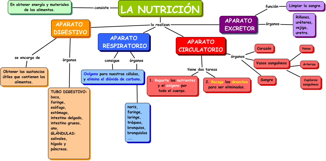 Este Cmap, tiene información relacionada con: LA NUTRICIÓN, LA NUTRICIÓN consiste En obtener energía y materiales de los alimentos., Vasos sanguíneos ???? Arterias, LA NUTRICIÓN la realizan APARATO DIGESTIVO, Vasos sanguíneos ???? Venas, APARATO EXCRETOR función Limpiar la sangre., LA NUTRICIÓN la realizan APARATO RESPIRATORIO, APARATO RESPIRATORIO consigue Oxígeno para nuestras células, y elimina el dióxido de carbono., Vasos sanguíneos ???? Capilares sanguíneos, APARATO DIGESTIVO órganos TUBO DIGESTIVO: boca, faringe, esófago, estómago, intestino delgado, intestino grueso, ano. GLÁNDULAS: salivales, hígado y páncreas., LA NUTRICIÓN la realizan APARATO EXCRETOR, APARATO CIRCULATORIO tiene dos tareas 2. Recoge los desechos para ser eliminados., APARATO CIRCULATORIO órganos Corazón, APARATO DIGESTIVO se encarga de Obtener las sustancias útiles que contienen los alimentos., APARATO RESPIRATORIO órganos nariz, faringe, laringe, tráquea, bronquios, bronquiolos ..., APARATO CIRCULATORIO órganos Sangre, APARATO CIRCULATORIO tiene dos tareas 1. Reparte los nutrientes y el oxígeno por todo el cuerpo., APARATO EXCRETOR órganos Riñones, uréteres, vejiga, uretra., APARATO CIRCULATORIO órganos Vasos sanguíneos, LA NUTRICIÓN la realizan APARATO CIRCULATORIO