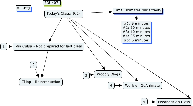 This Concept Map, created with IHMC CmapTools, has information related to: Agenda 9-24, Today's Class: 9/24 Work on GoAnimate, Today's Class: 9/24 Time Estimates per activity, Today's Class: 9/24 Mia Culpa - Not prepared for last class, 4 Work on GoAnimate, 1 Mia Culpa - Not prepared for last class, 5 Feedback on Class, 3 Weebly Blogs, Today's Class: 9/24 Weebly Blogs, Today's Class: 9/24 Feedback on Class, Time Estimates per activity #1: 5 minutes #2: 10 minutes #3: 10 minutes #4: 35 minutes #5: 5 minutes, Mia Culpa - Not prepared for last class CMap - Reintroduction, 2 CMap - Reintroduction