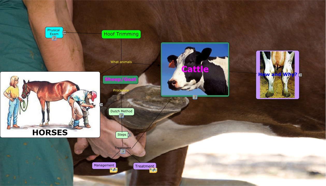 This Concept Map, created with IHMC CmapTools, has information related to: Hoof Trimming, Dutch Method Steps 4. Relieve pain off painful claw, Complications such as Opening the heels, Dutch Method Steps 3. Dish Soles, Other Hoof Problems include Severe overgrowth, High heel that may lead to Other Hoof Problems, Horses with respect to Owner, Horses knowledge of Outcome, Hoof Trimming Physical Exam Hoof Evaluation, Long toe that may lead to Other Hoof Problems, Dutch Method Steps 1. Toe Trim, Prevention & Treatment such as Thrush, Indications such as Other Hoof Problems, Dutch Method Steps 5. Remove loose/under-run horn and hard ridges, Prevention & Treatment such as Club Foot, Overgrown Hooves for instance Long toe, Sheep/Goat Procedure Dutch Method, Hoof Trimming Physical Exam Lameness, Cattle Treatment Treatment, Hoof Trimming What animals Cattle, Prevention & Treatment such as Sheared Heel