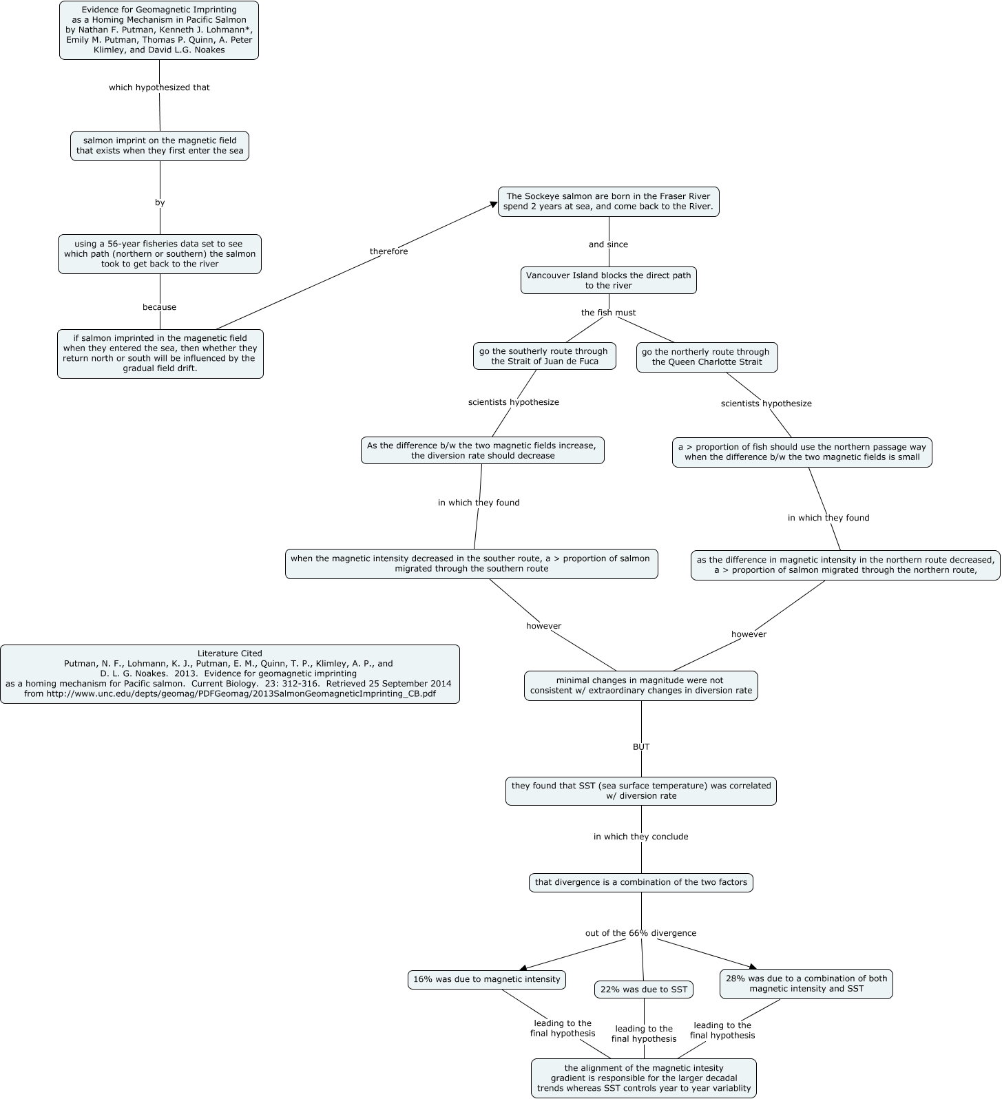 This Concept Map, created with IHMC CmapTools, has information related to: CMap 4 (Geomagnetic Imprinting in Pacific Salmon by KJ Lohmann), that divergence is a combination of the two factors out of the 66% divergence 16% was due to magnetic intensity, go the northerly route through the Queen Charlotte Strait scientists hypothesize a > proportion of fish should use the northern passage way when the difference b/w the two magnetic fields is small, salmon imprint on the magnetic field that exists when they first enter the sea by using a 56-year fisheries data set to see which path (northern or southern) the salmon took to get back to the river, Vancouver Island blocks the direct path to the river the fish must go the northerly route through the Queen Charlotte Strait, Evidence for Geomagnetic Imprinting as a Homing Mechanism in Pacific Salmon by Nathan F. Putman, Kenneth J. Lohmann*, Emily M. Putman, Thomas P. Quinn, A. Peter Klimley, and David L.G. Noakes which hypothesized that salmon imprint on the magnetic field that exists when they first enter the sea, as the difference in magnetic intensity in the northern route decreased, a > proportion of salmon migrated through the northern route, however minimal changes in magnitude were not consistent w/ extraordinary changes in diversion rate, The Sockeye salmon are born in the Fraser River spend 2 years at sea, and come back to the River. and since Vancouver Island blocks the direct path to the river, using a 56-year fisheries data set to see which path (northern or southern) the salmon took to get back to the river because if salmon imprinted in the magenetic field when they entered the sea, then whether they return north or south will be influenced by the gradual field drift., that divergence is a combination of the two factors out of the 66% divergence 28% was due to a combination of both magnetic intensity and SST, 22% was due to SST leading to the final hypothesis the alignment of the magnetic intesity gradient is responsible for the larger decadal trends whereas SST controls year to year variablity, they found that SST (sea surface temperature) was correlated w/ diversion rate in which they conclude that divergence is a combination of the two factors, minimal changes in magnitude were not consistent w/ extraordinary changes in diversion rate BUT they found that SST (sea surface temperature) was correlated w/ diversion rate, that divergence is a combination of the two factors out of the 66% divergence 22% was due to SST, when the magnetic intensity decreased in the souther route, a > proportion of salmon migrated through the southern route however minimal changes in magnitude were not consistent w/ extraordinary changes in diversion rate, a > proportion of fish should use the northern passage way when the difference b/w the two magnetic fields is small in which they found as the difference in magnetic intensity in the northern route decreased, a > proportion of salmon migrated through the northern route,, if salmon imprinted in the magenetic field when they entered the sea, then whether they return north or south will be influenced by the gradual field drift. therefore The Sockeye salmon are born in the Fraser River spend 2 years at sea, and come back to the River., As the difference b/w the two magnetic fields increase, the diversion rate should decrease in which they found when the magnetic intensity decreased in the souther route, a > proportion of salmon migrated through the southern route, 28% was due to a combination of both magnetic intensity and SST leading to the final hypothesis the alignment of the magnetic intesity gradient is responsible for the larger decadal trends whereas SST controls year to year variablity, Vancouver Island blocks the direct path to the river the fish must go the southerly route through the Strait of Juan de Fuca, 16% was due to magnetic intensity leading to the final hypothesis the alignment of the magnetic intesity gradient is responsible for the larger decadal trends whereas SST controls year to year variablity
