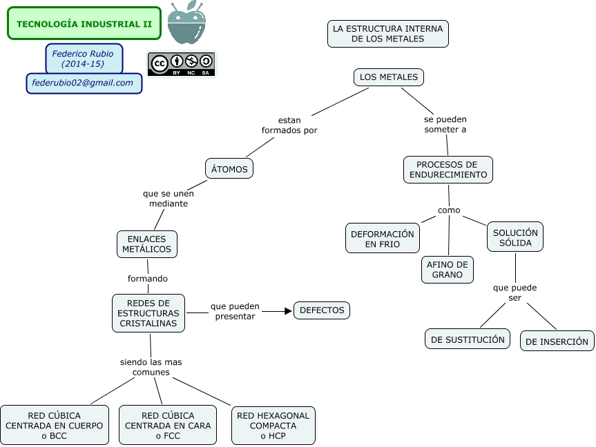 Este Cmap, tiene información relacionada con: 01-Estructura interna, REDES DE ESTRUCTURAS CRISTALINAS que pueden presentar DEFECTOS, SOLUCIÓN SÓLIDA que puede ser DE INSERCIÓN, SOLUCIÓN SÓLIDA que puede ser DE SUSTITUCIÓN, PROCESOS DE ENDURECIMIENTO como DEFORMACIÓN EN FRIO, PROCESOS DE ENDURECIMIENTO como AFINO DE GRANO, REDES DE ESTRUCTURAS CRISTALINAS siendo las mas comunes RED HEXAGONAL COMPACTA o HCP, LOS METALES se pueden someter a PROCESOS DE ENDURECIMIENTO, PROCESOS DE ENDURECIMIENTO como SOLUCIÓN SÓLIDA, REDES DE ESTRUCTURAS CRISTALINAS siendo las mas comunes RED CÚBICA CENTRADA EN CARA o FCC, REDES DE ESTRUCTURAS CRISTALINAS siendo las mas comunes RED CÚBICA CENTRADA EN CUERPO o BCC, ENLACES METÁLICOS formando REDES DE ESTRUCTURAS CRISTALINAS, LOS METALES estan formados por ÁTOMOS, ÁTOMOS que se unen mediante ENLACES METÁLICOS